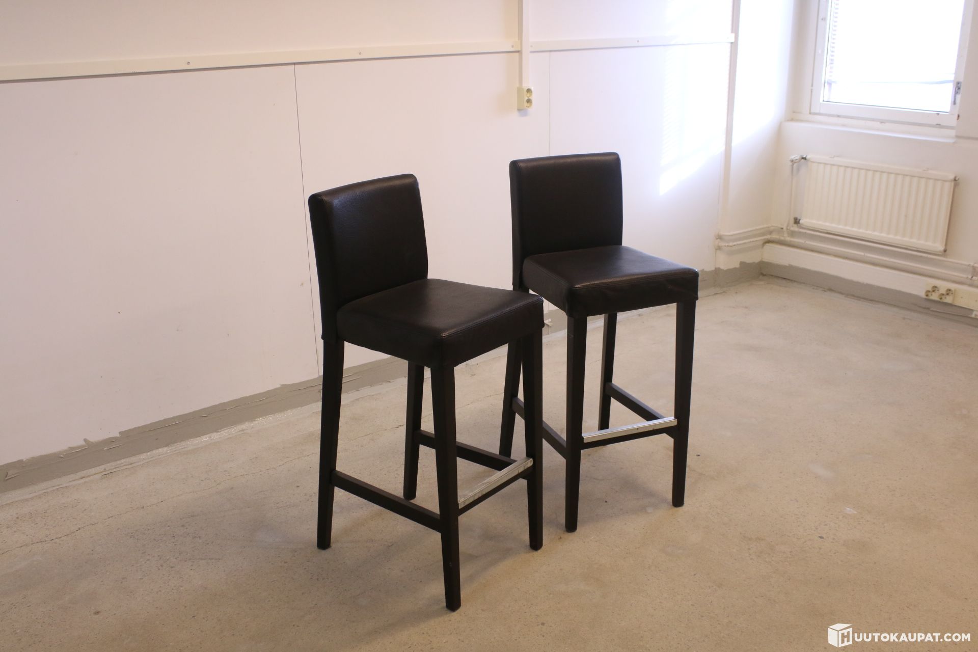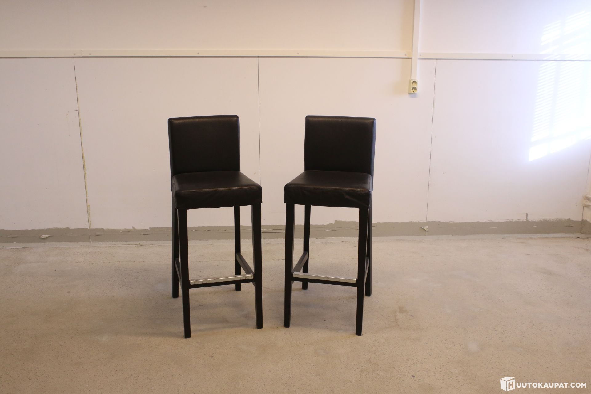 Kaksi mustaa baarijakkaraa mustalla nahkapäällysteellä.