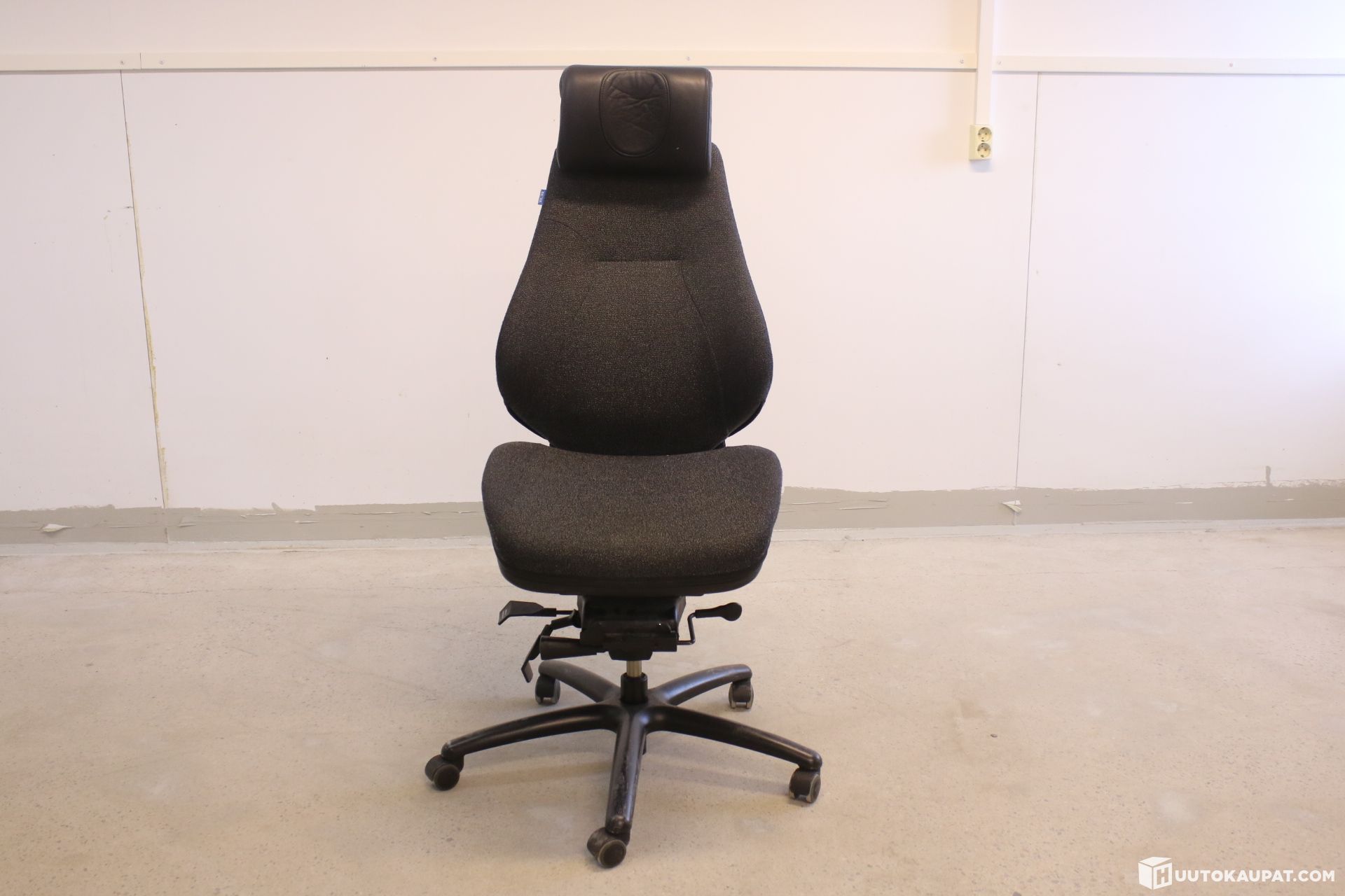 Täyssäädettävä valvomotuoli, nahkaisella niskatuella.