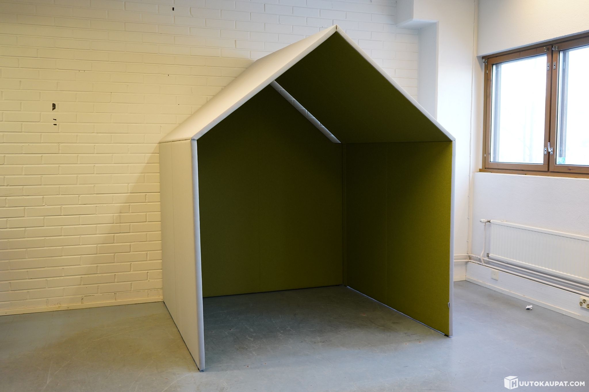 The Hut sopii moneen tarkoitukseen: usean hengen työtilaksi ta pieneksi tapaamispaikaksi. Hutin voi kalustaa parhaaksi näkemällään tavalla. Vaaleanharmaa ulkopinta ja vihreä sisäpinta.