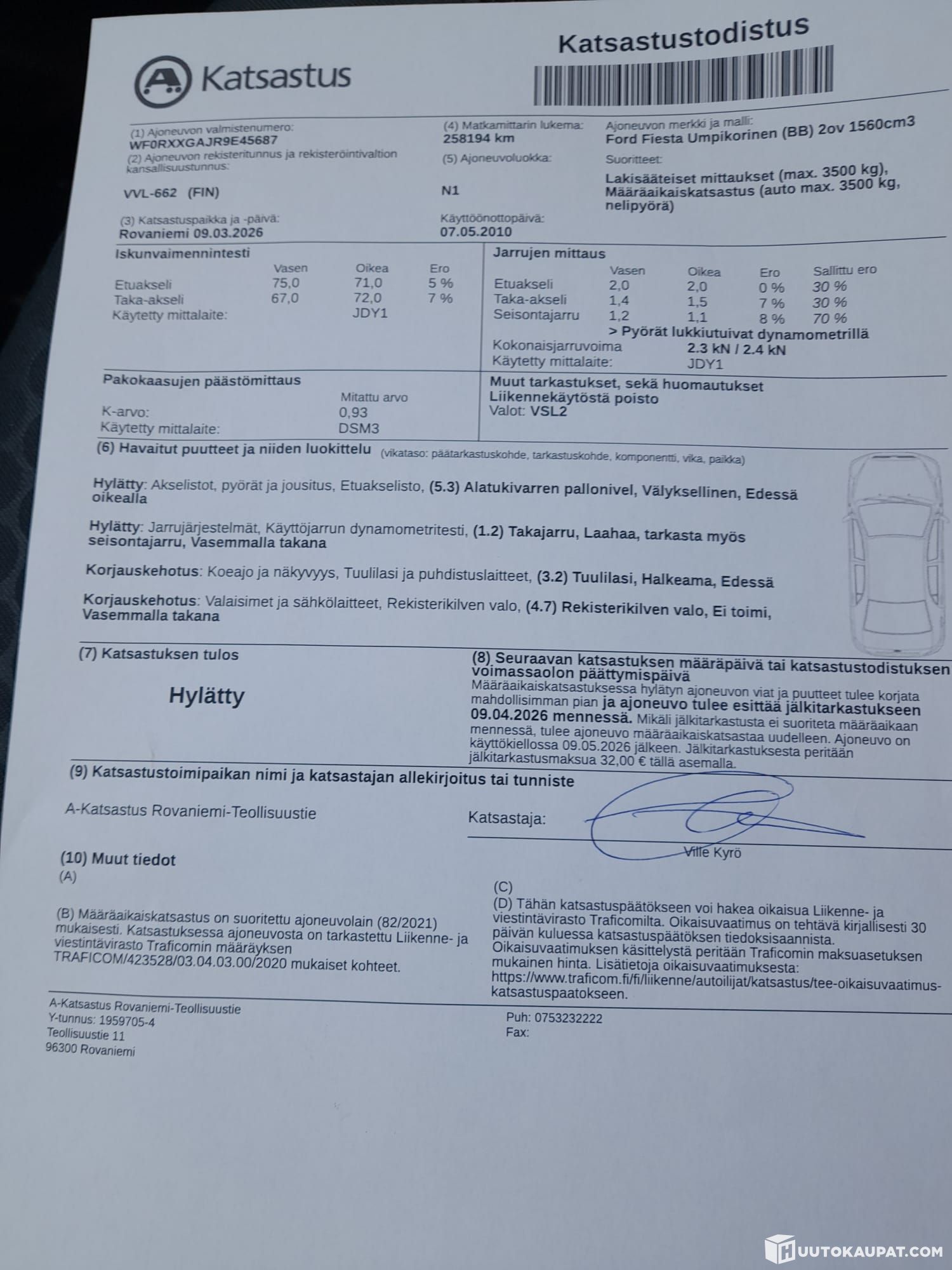 - Hylätty katsastuksesta, katso kuva katsastuslapusta