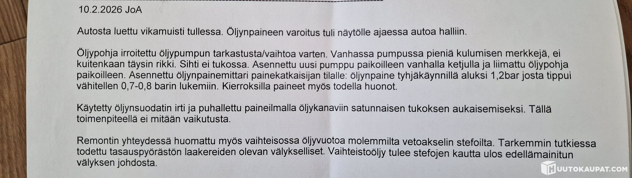 Viety korjaamolle, koska jäähdytysneste vuosi ja öljynmoottoripainevalo rupesi vilkkumaan kylmällä moottorilla ajaessa.