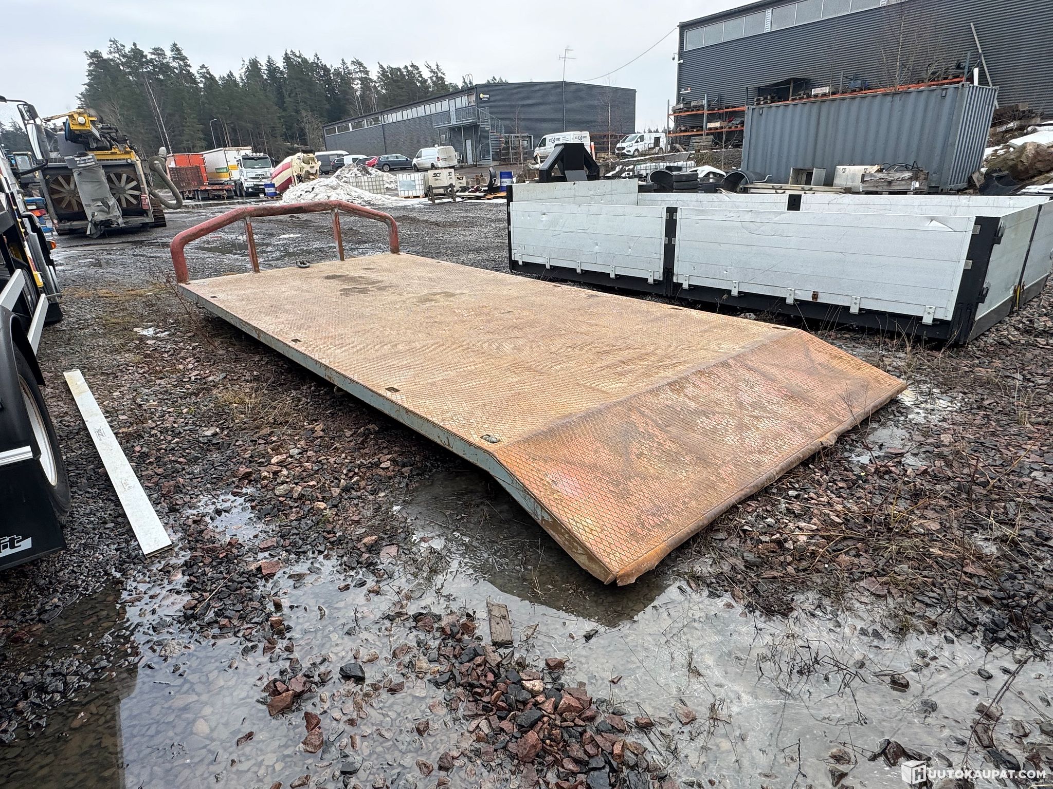 Käytetty vahva konelava vaijeritartunnalla, teräs kansi 5,3 m ja viiste 0,7 m, kokonaismitta 6m, paljon sidonta lenkkejä.
