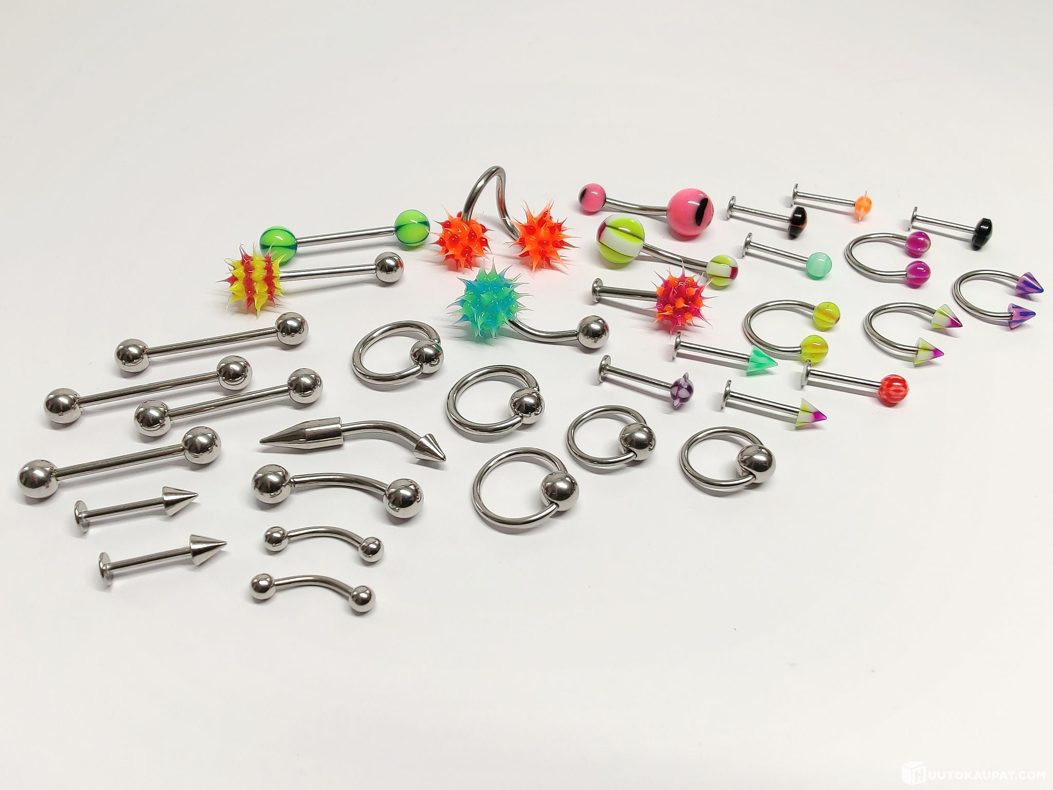 Valikoima kirurginteräksisiä lävistyskoruja. Osassa koristeosien materiaalina silikoni ja muovi.