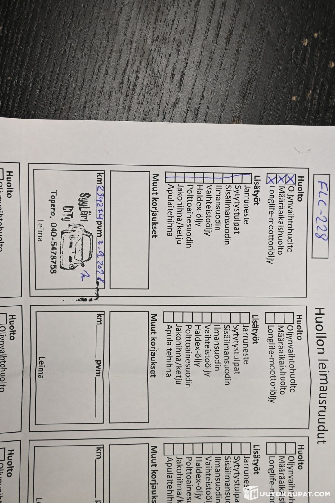 Huoltokirja: Säännöllinen huoltohistoria. Tarkemmin huollot kuvissa