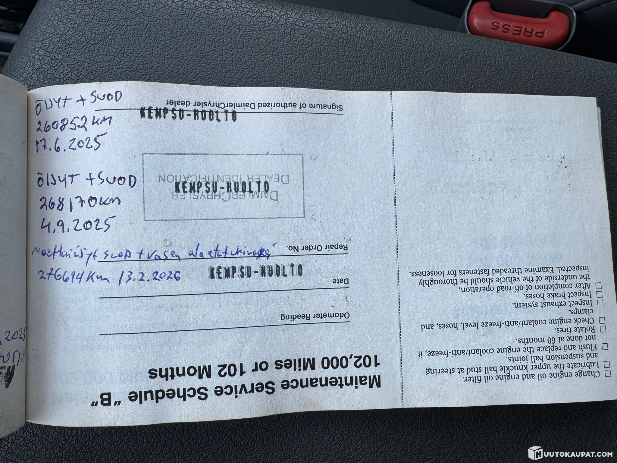 Ennen auton myyntiinlaittoa suoritimme autolle koeajon, jonka aikana teimme autosta seuraavat havainnot: