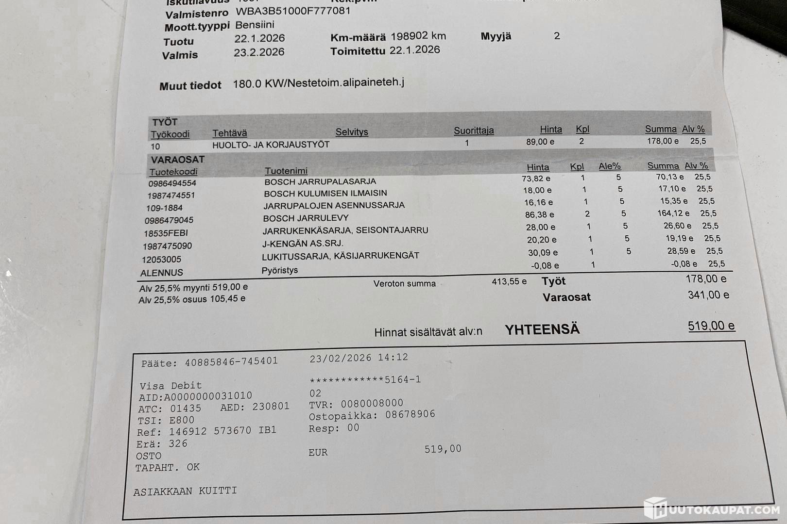 Tämän kohteen myyjä on Huutokaupat.com. Bavaria Finland Oy / Hedin Automotive antaa Huutokaupat.comin puolesta kohteesta lisätietoja ja vastaa kohteen luovutuksesta. Kohde tulee aina maksaa Huutokaupat.com-sivustolla olevien verkkomaksupainikkeiden kautta tai Huutokaupat.comin laskulla. Jos kohdetta ei makseta Huutokaupat.comille, Huutokaupat.com ei hyväksy mitään vastuuta kaupasta.