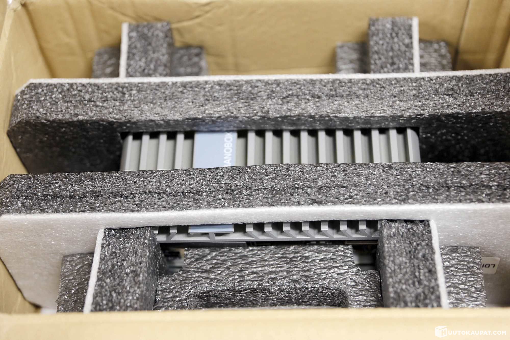 Avattu pakkaus, dokumentit ja USB-tikku mukana
