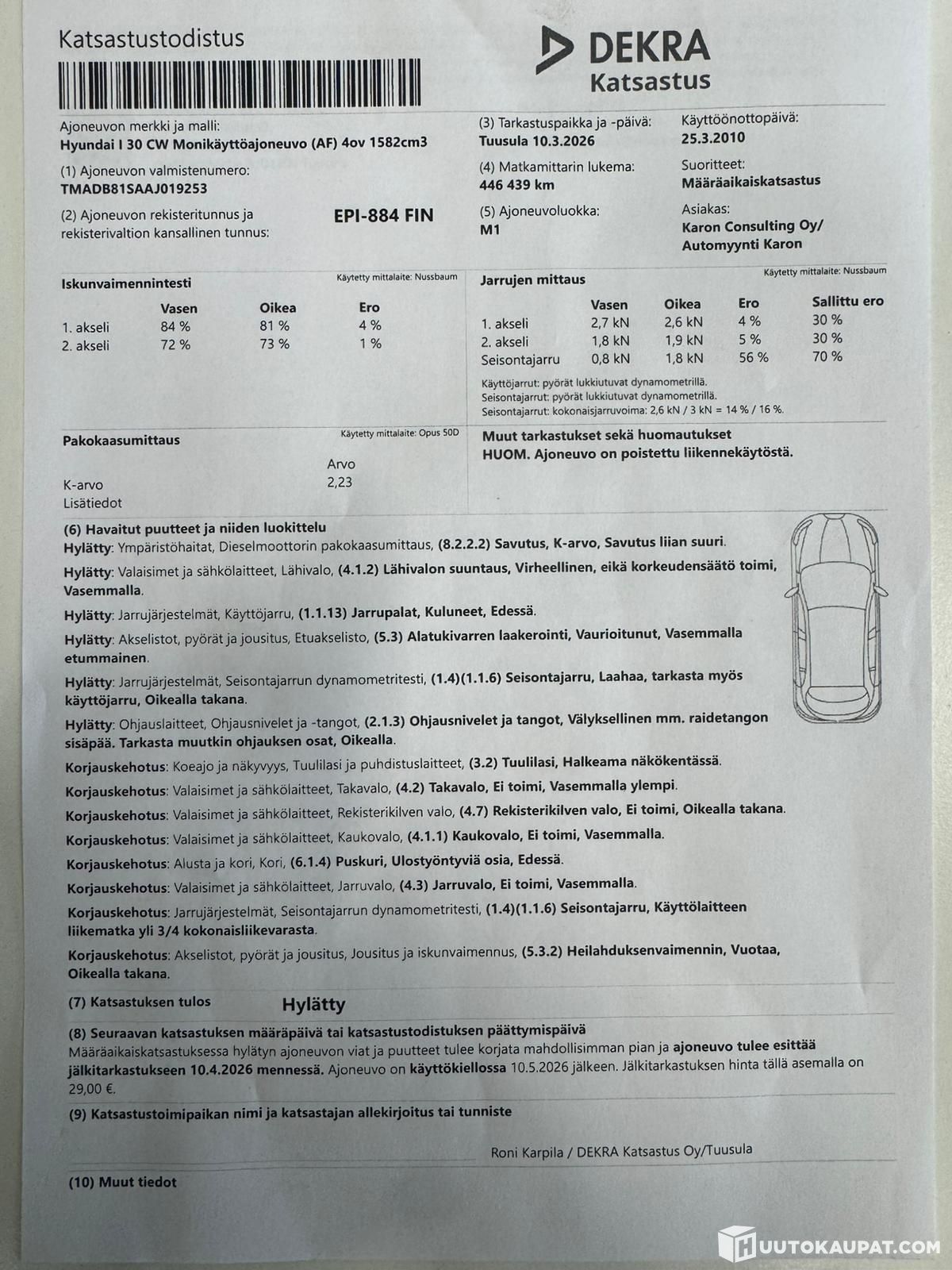 Tästä seuraavalle tee-se-itse miehelle projektia iltojen kuluksi! Auto käytetty katsastuksessa ja sieltä pieni vikalista tuli, ei pahakaan homma ja tuon tekee vaikka kerrostalon parkkipaikalla! Autolla tehtiin n. 20min koeajo lenkki ja siinä havaittiin seuraavat asiat. Starttaus normaalia pidempi, mutta lähtee käyntiin / alusta hieman kolisee / kesärenkaat vaihdon tarpeessa (Joku hurja saattaa vielä yhden kesän ajaa) muutoin auto vaikutti fiksulta ajolleen. Tästä siis kakkos autoksi tai ensi autoksi tai kulkineeksi päivittäiseen ajoon! Ajoaikaa on 10.05.2026 asti. Viimeisessä kuvassa vikalista.