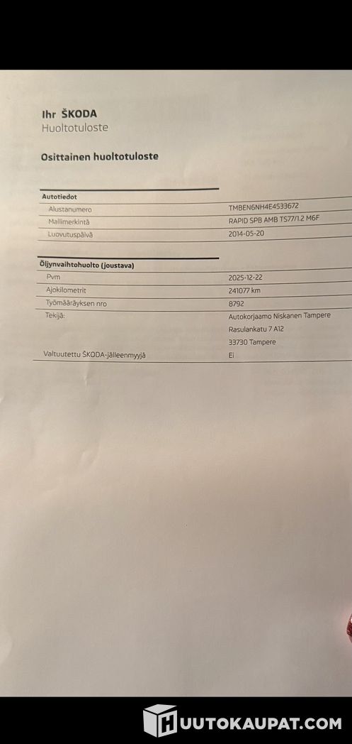 Myydään Skoda Rapid Spaceback 2014, ajettu 241 000 km, hyvässä teknisessä kunnossa ja asiallisella varustelulla.