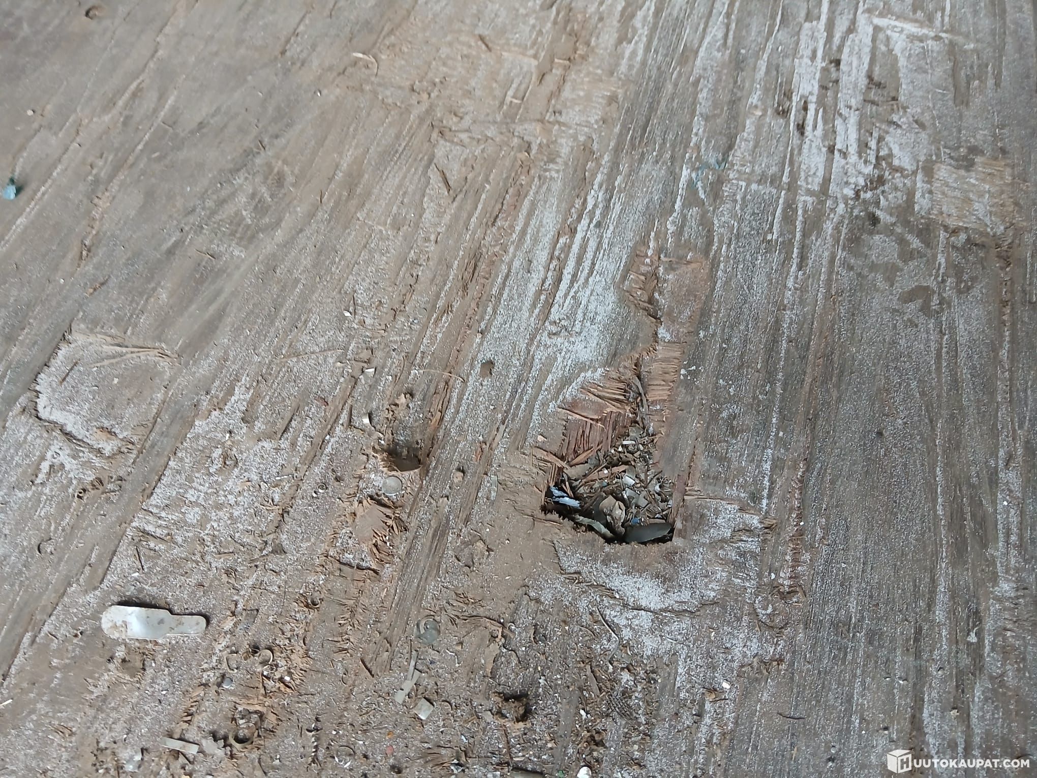 Lattiassa näkyvissä kulumaa sekä ovessa selkeä reikä (ks. kuvat)