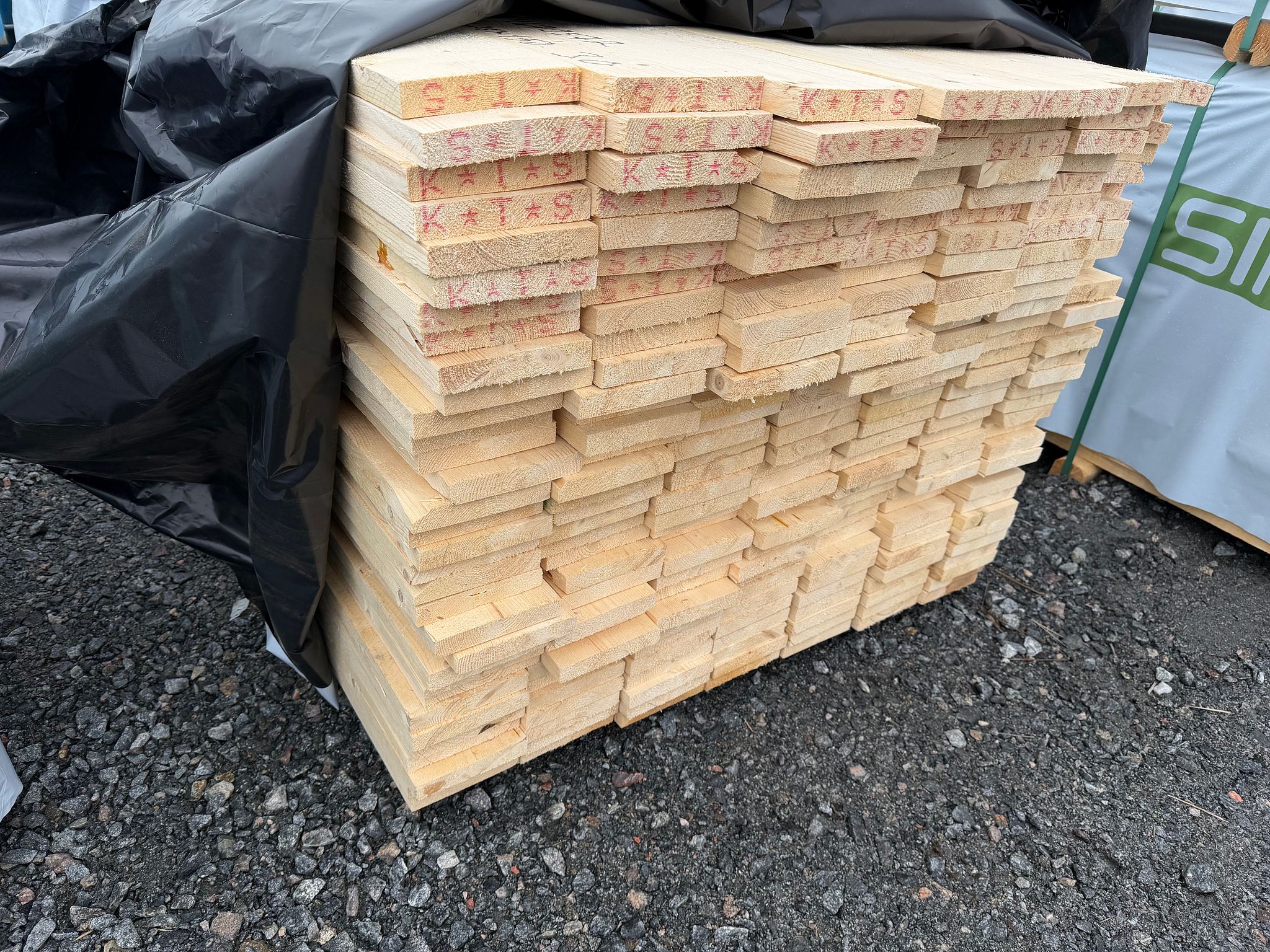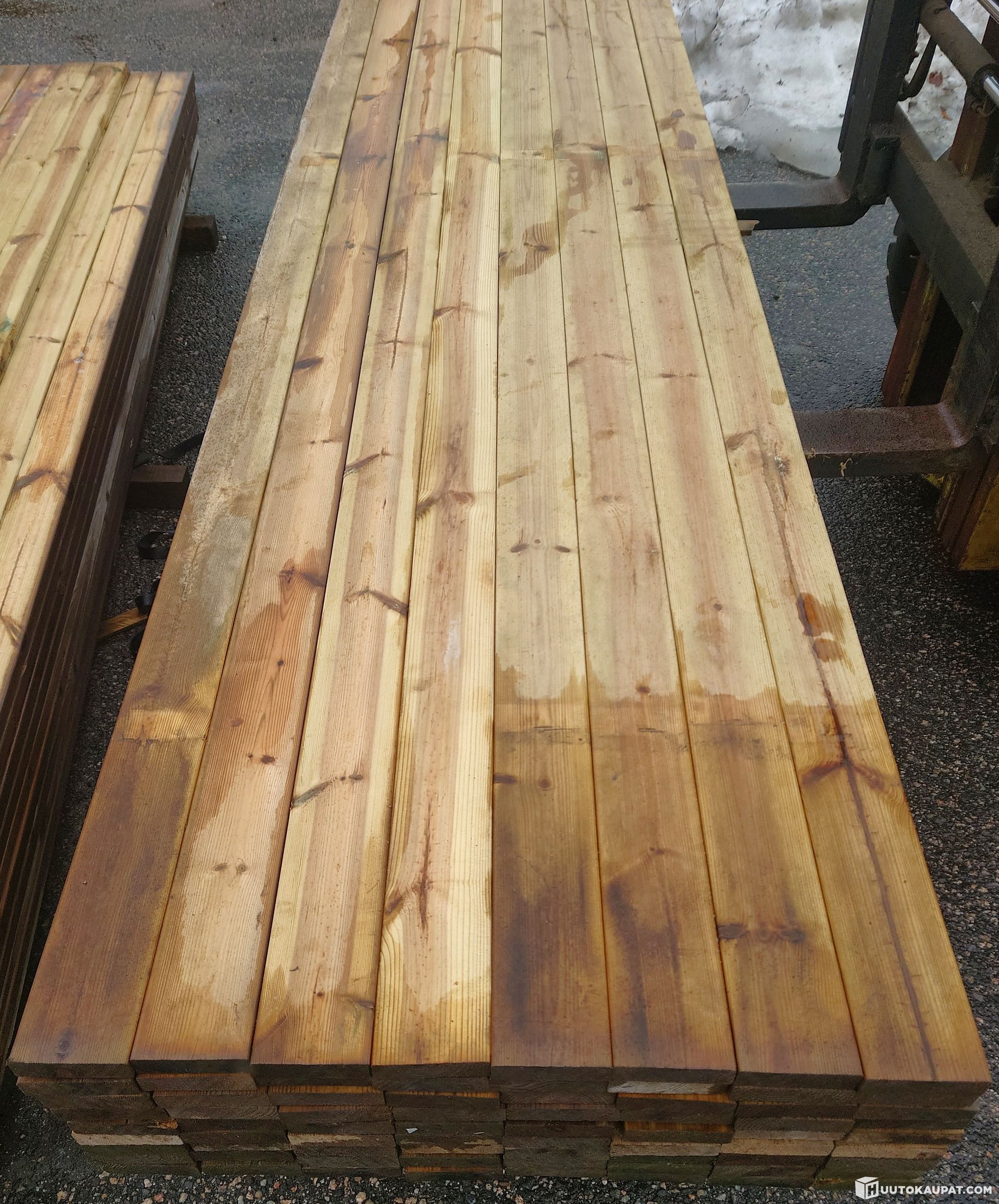 Tarjolla 237,6 m erä vihreäkyllästettyä sileähöylättyä 28x95 mm terassilautaa. Lautoja on nipussa 72 kpl pituudeltaan 3,3 m. Laudat ovat terveoksaista 2-laatua. Ei oksanreikiä. Määrällä kattaa n. 23 neliön alan kolmen millin rakoa käyttämällä. Kaikkien lautojen laatu näkyy kuvista.