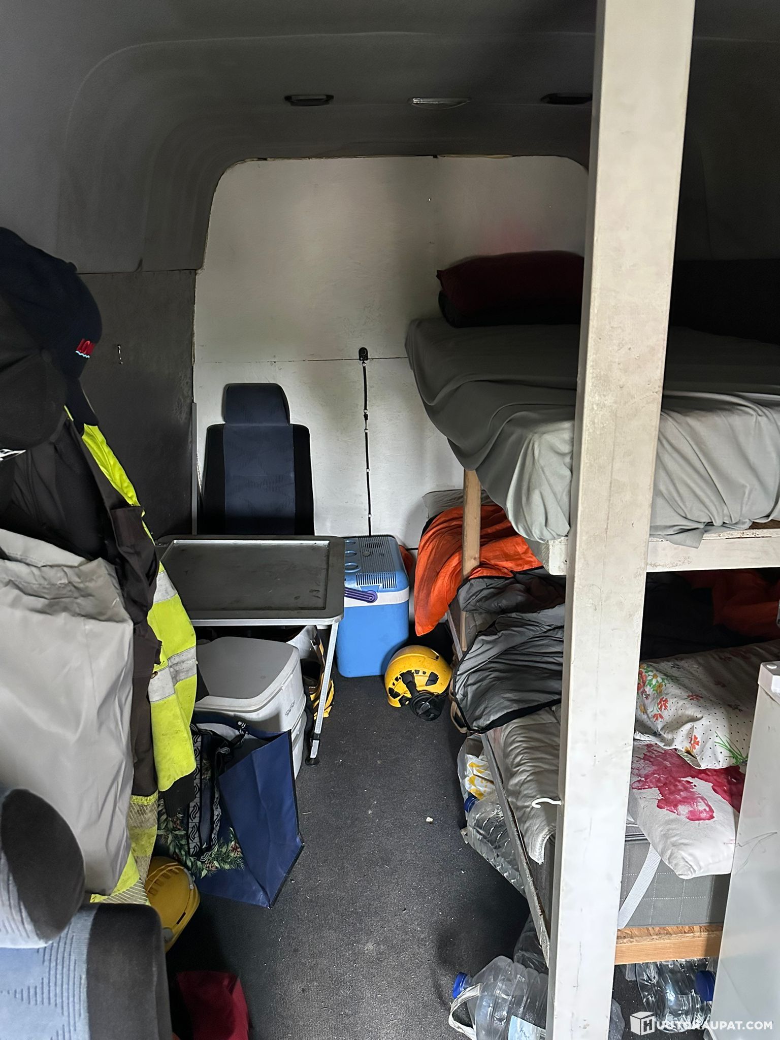 Sisällä kerrossängyt ja ilmawebasto ja aurinkopaneelit katolla.