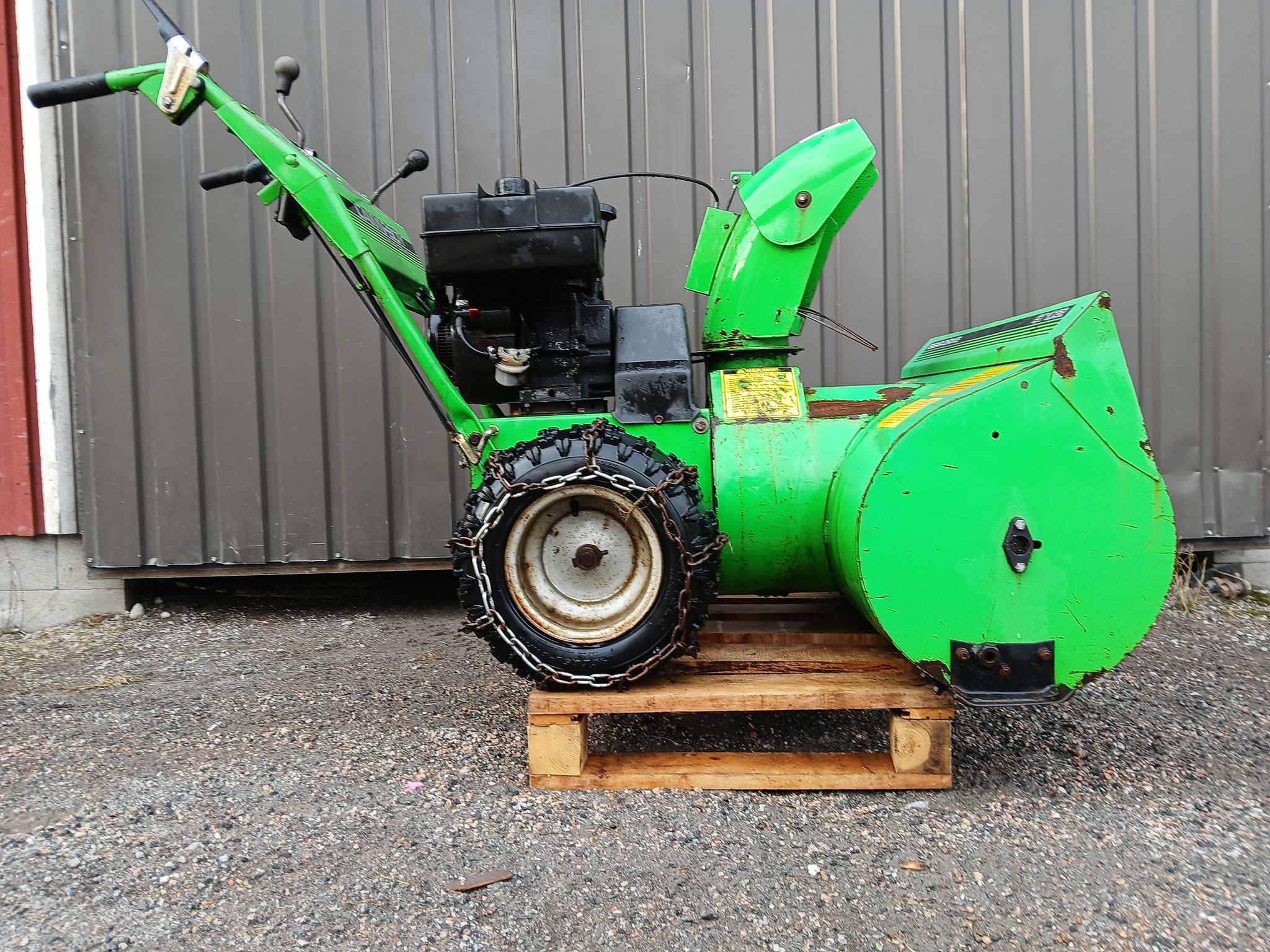 Todellinen sarvitraktori peräjyrsimellä,lisäpainoilla ja rajuilla telapyörillä.irtomoottorilla joka luultavimmin kuuluu kyseeseen koneeseen.laite on seissyt kauan.tämän kun entisöi niin ei varmasti tule aivan heti vastaavaa vastaan.tämä kone on RAUTAA eikä mitään kiinan peltiä.laitteelle saadaan tarvittaessa järjestettyä kuljetus koko suomen alueella kotipihaan asti toimitettuna.noudettaessa laitetta itse saadaan se nostettua kyytiin trukilla veloituksetta.muutenkaan ei laitteen noudosta ei peritä mitään noutomaksuja/noutokuluja.noutoajankohta saadaan myös järjestymään joustavasti iltaisin ja viikonloppuisinkin.noudolla ei myöskään ole kiirettä saadaan sovittua todella joustavasti tarvittaessa..