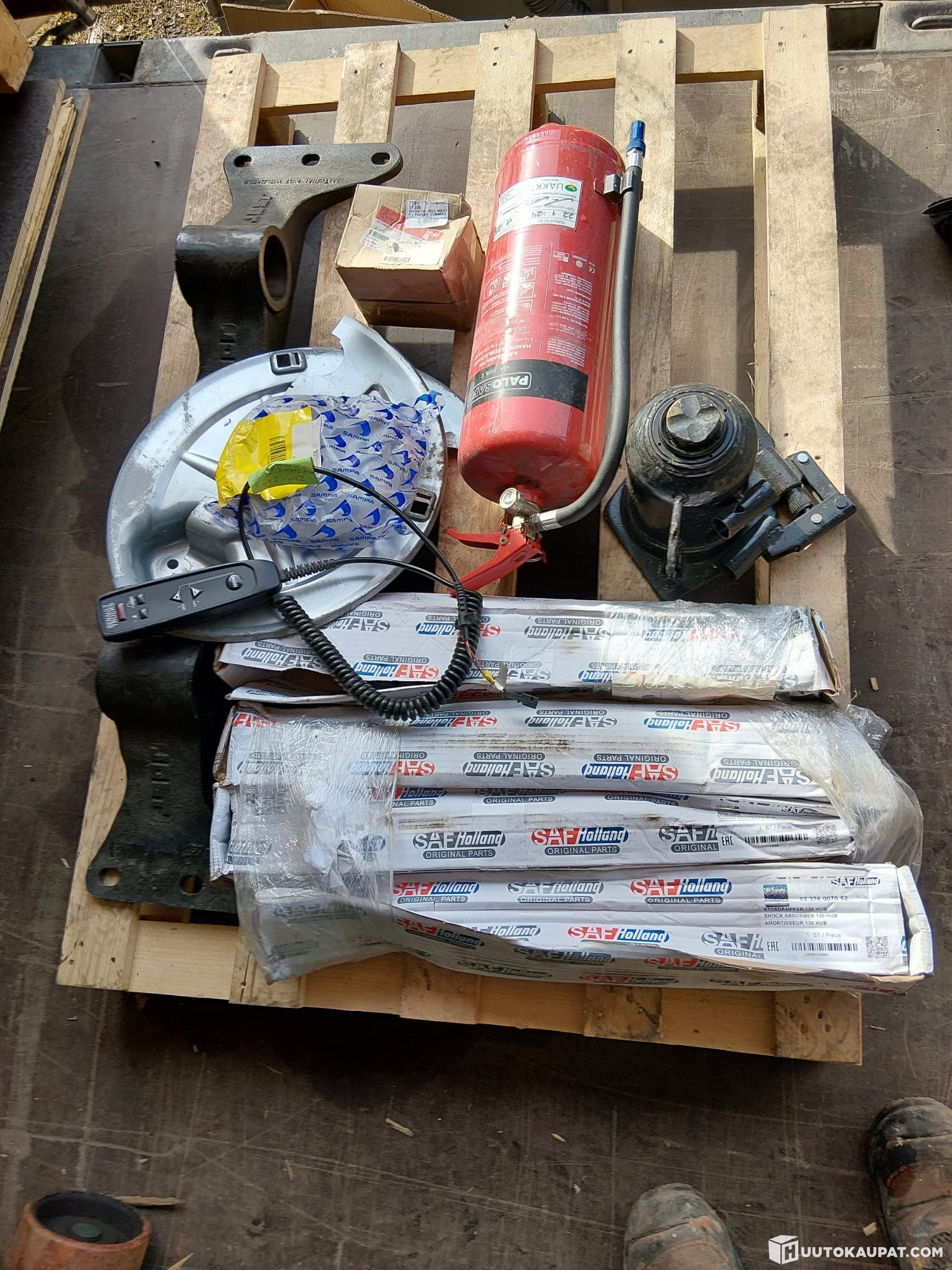 SAF Iskunvaimentajat 4kpl (ovh 118eur/kpl), JOST vetopöydän osat, jarrukilpipari, Renaultin jousituksen ohjauskapula, tunkki, ym osia.