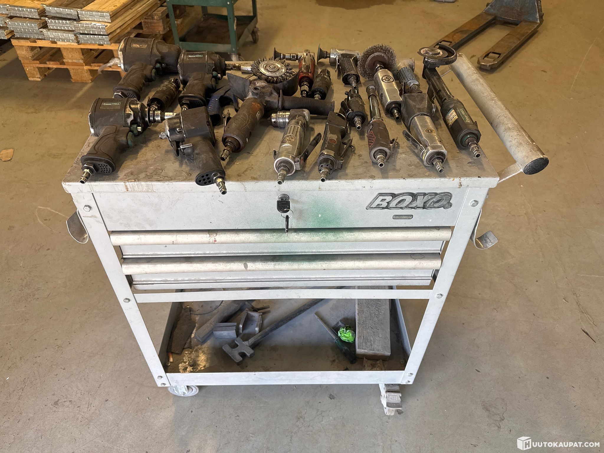 Boxo työpöytä, vaunu, työkaluja (erä 1908) Auto - Muovi Oy KEM konkurssipesä 3598660-7, Helsinki