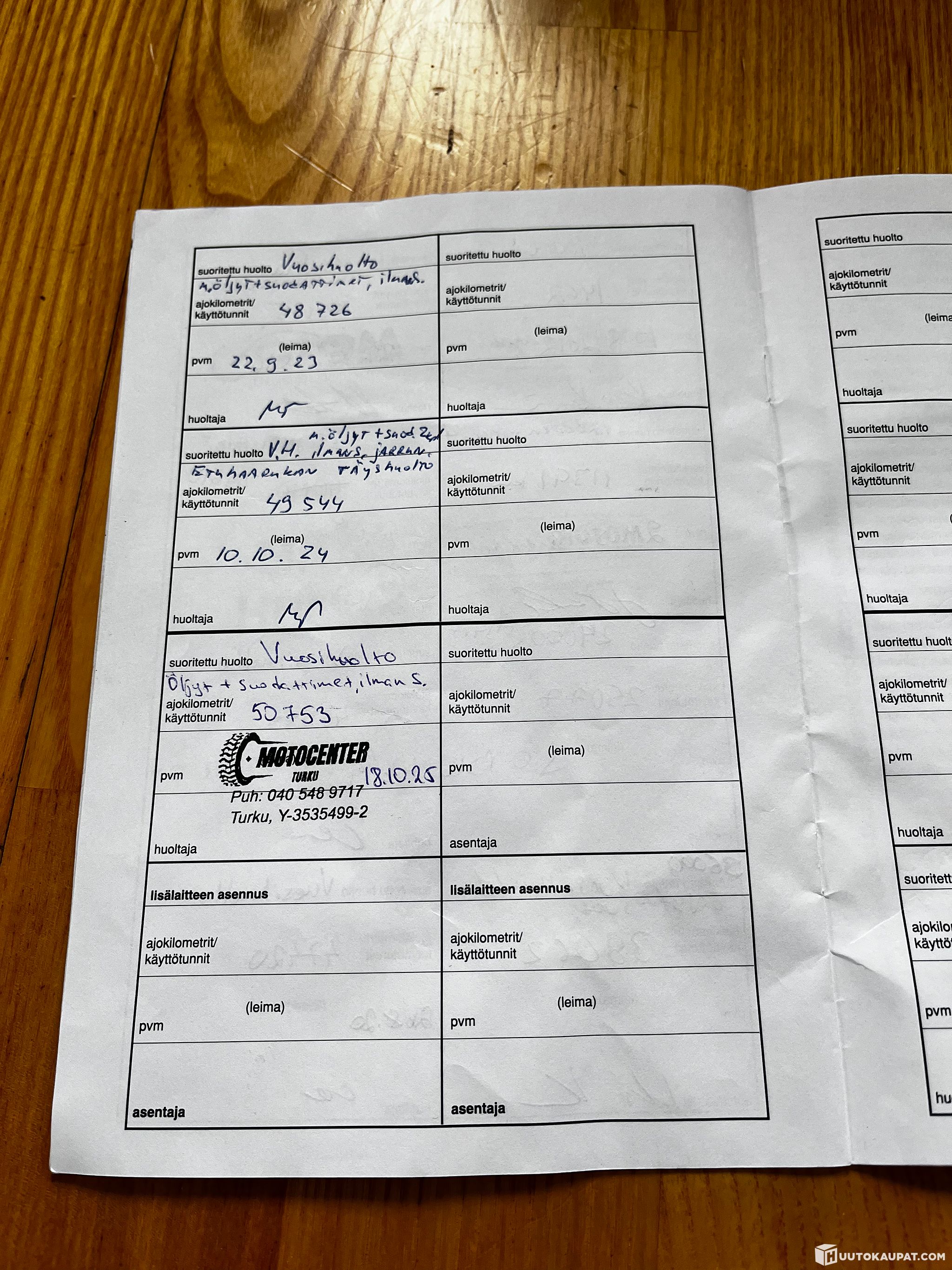 Huoltokirjasta puuttuu muutama leimaa, mutta huollot on tehty ajallaan: