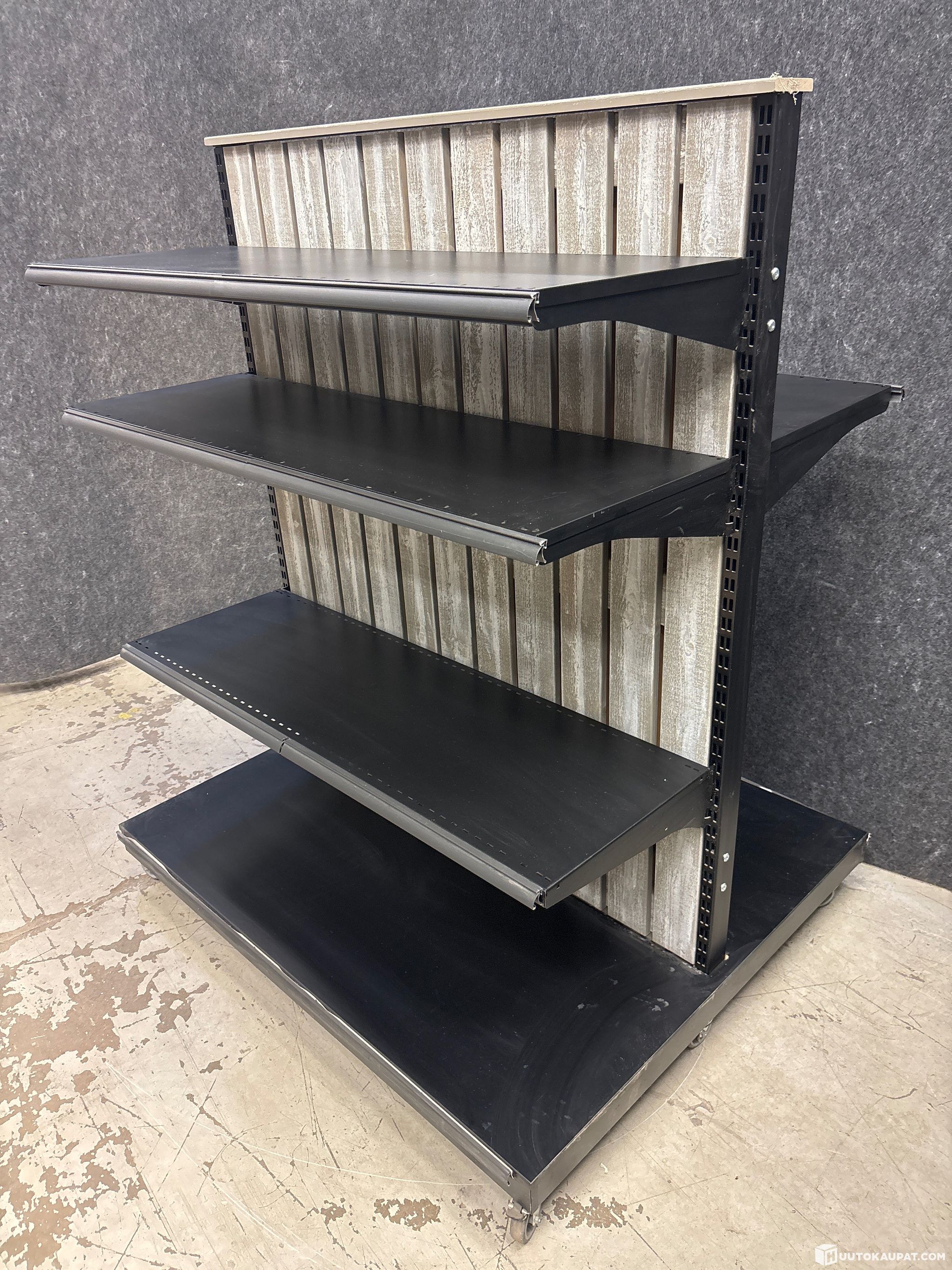 Mitat: pituus 29cm, syvyys 110cm, korkeus 159cm. Metallirunko, puinen pohjalevy ja välikkö, pyörät alla.