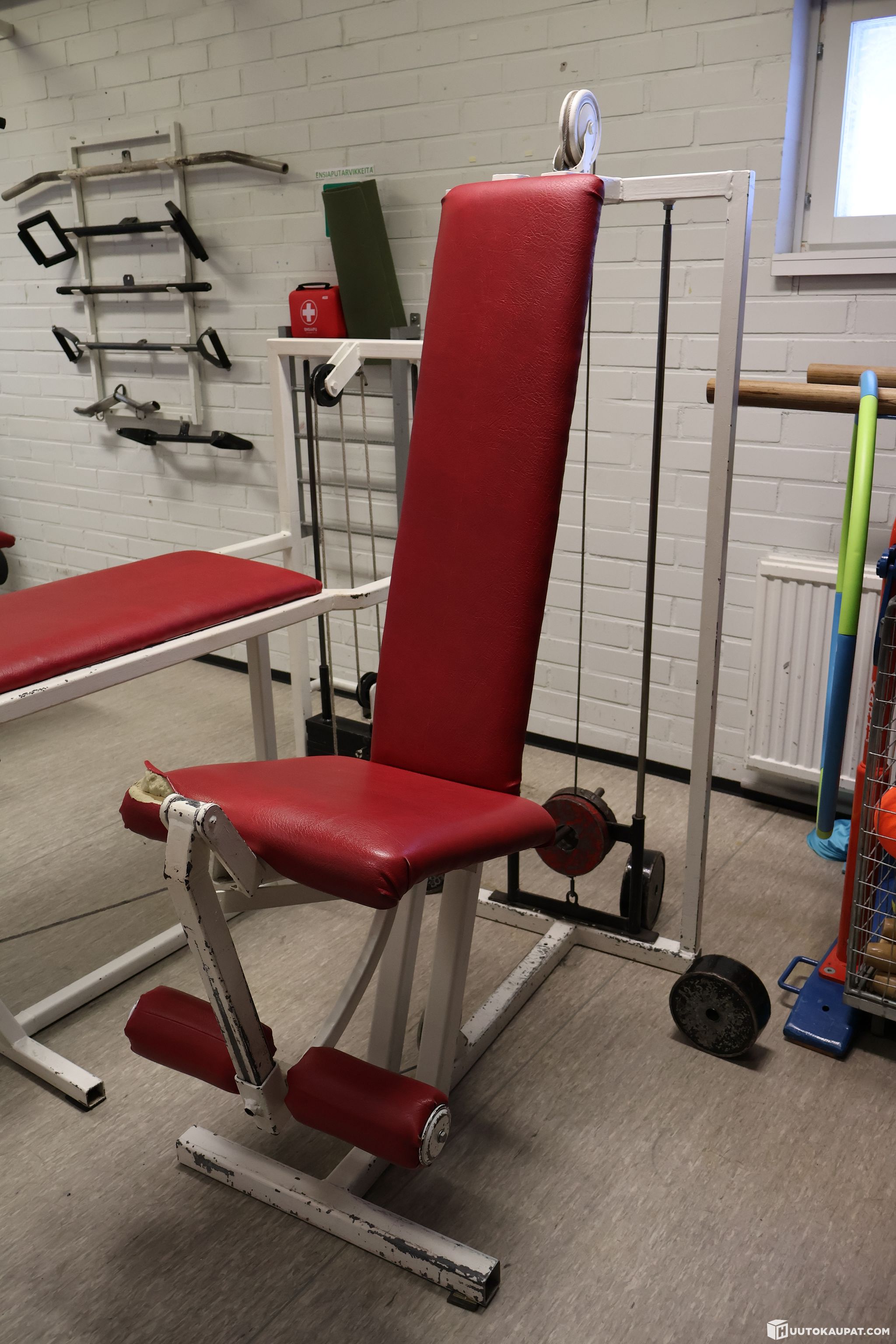 Nahka revennyt istuimesta, liitteenä kuva. Aiemmin vaijeri katkennut reiden ojennus laitteesta, mutta vika korjattu.