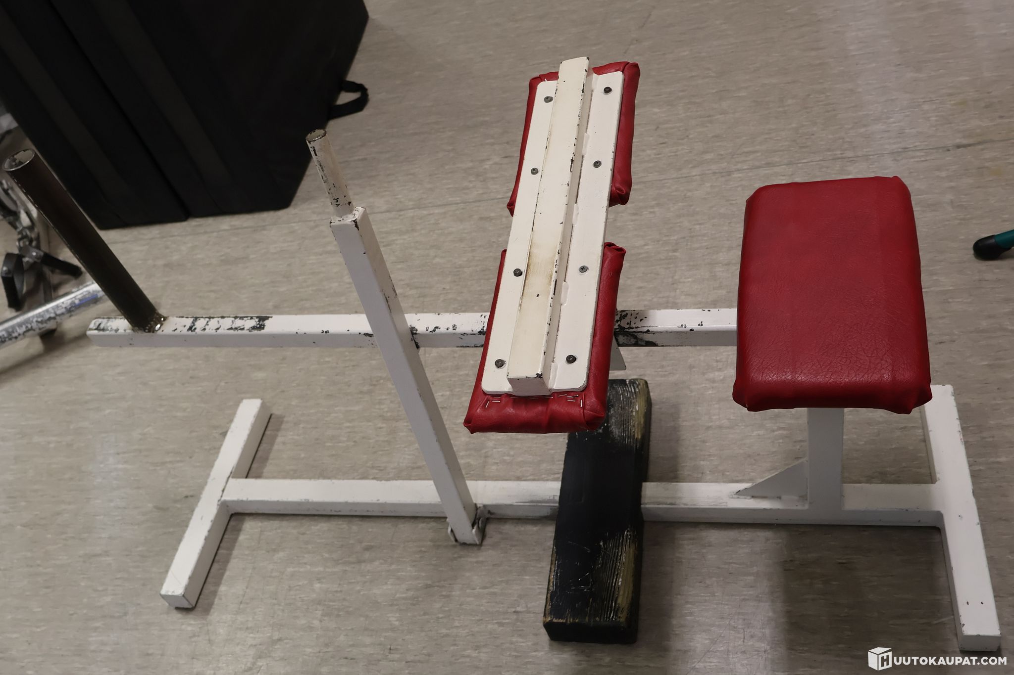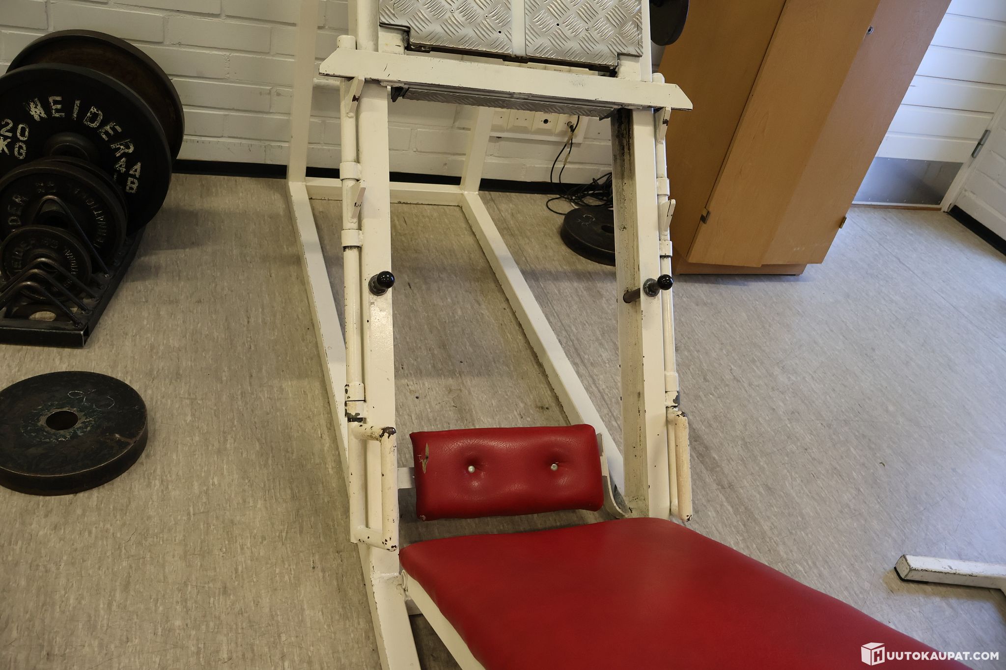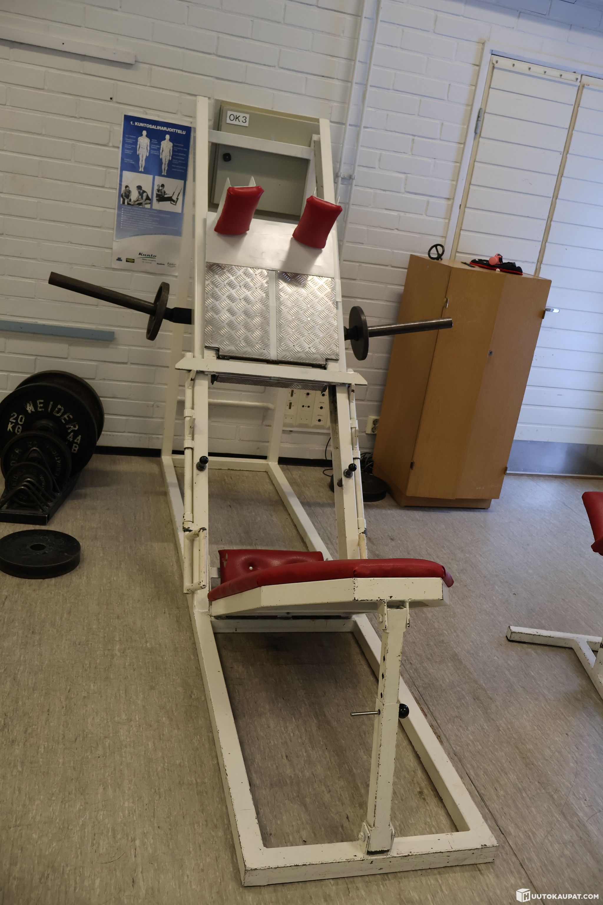 Hyrynsalmen liikuntahallin vanhalta kuntosalilta jalkaprässi ja pohjelaite. Laitteissa käytettävät levypainot eivät kuulu huutokauppaan.