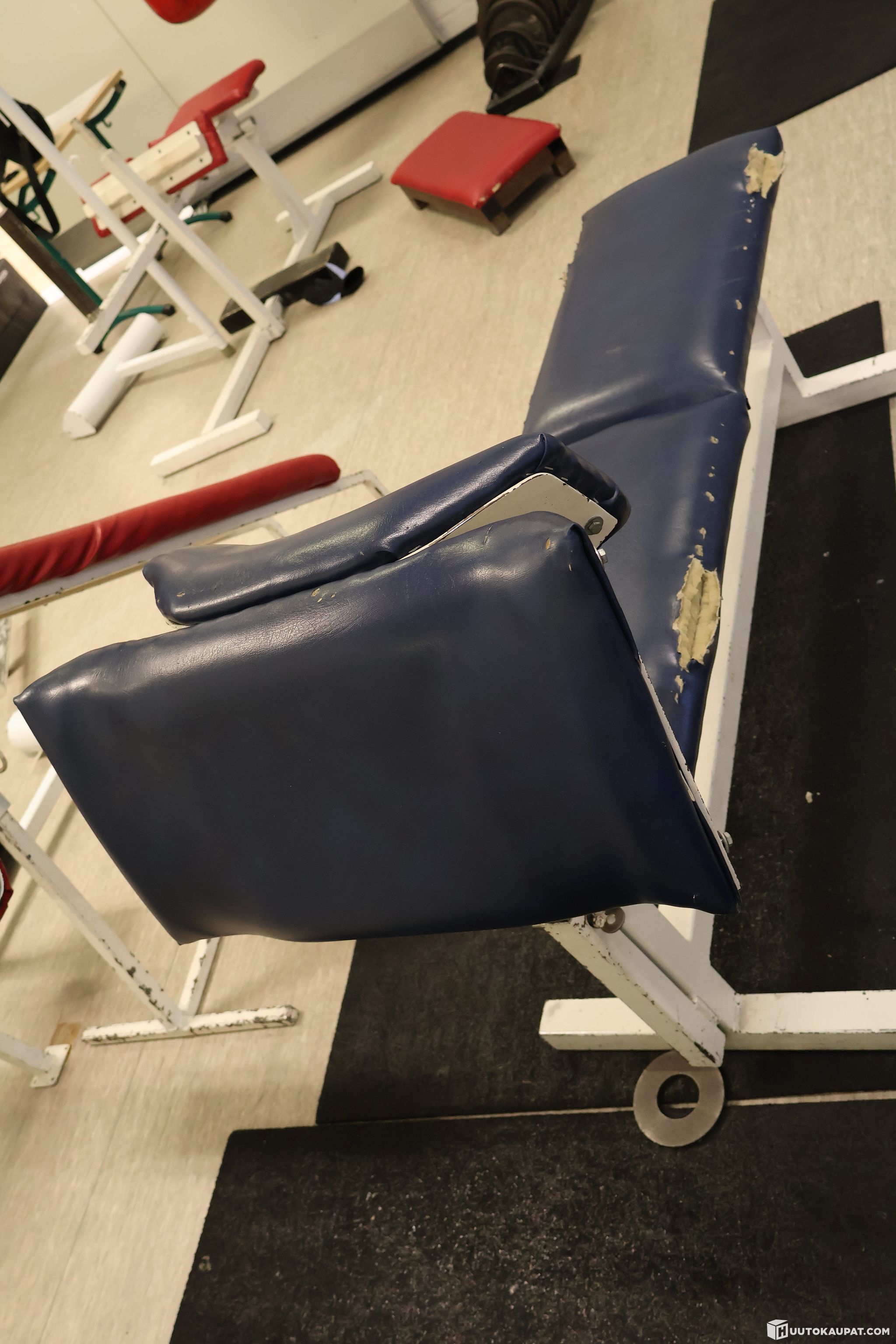 Nahka revennyt punnerruspenkistä pään kohdalta sekä hauispenkistä useammasta kohdasta sivuilta.