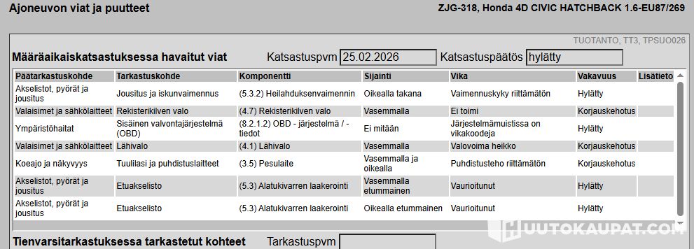 - Käynnistyy ja käy hyvin. Ajoltaan ok. Katsastus hylätty, kuvissa lappu