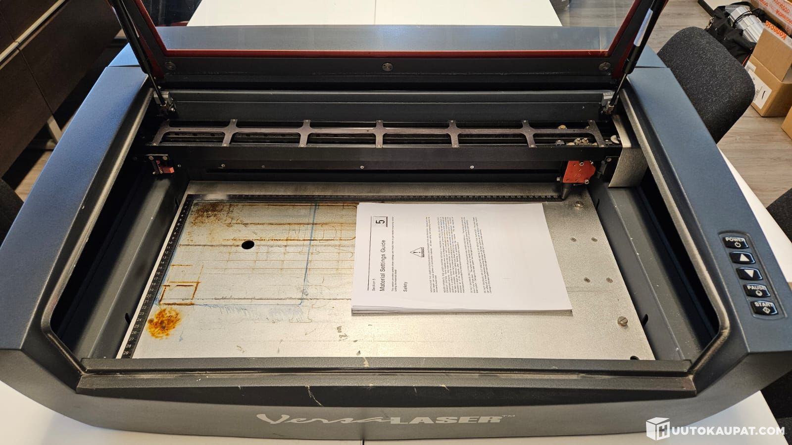 Myydään käytöstä laser kaiverruskone, kaiverrusohjelma, sekä kaiverruskoneen kennoleikkauspöytä.