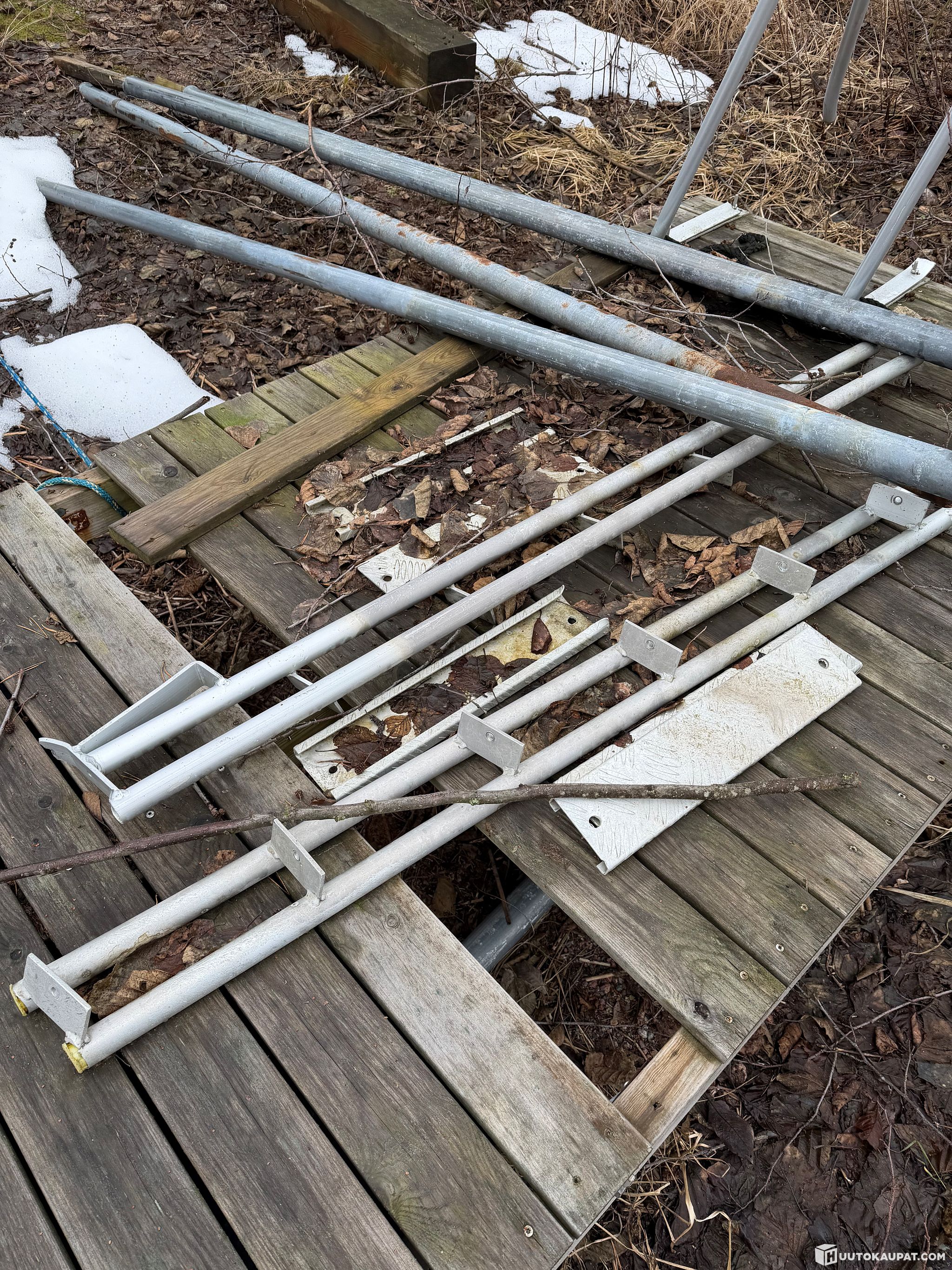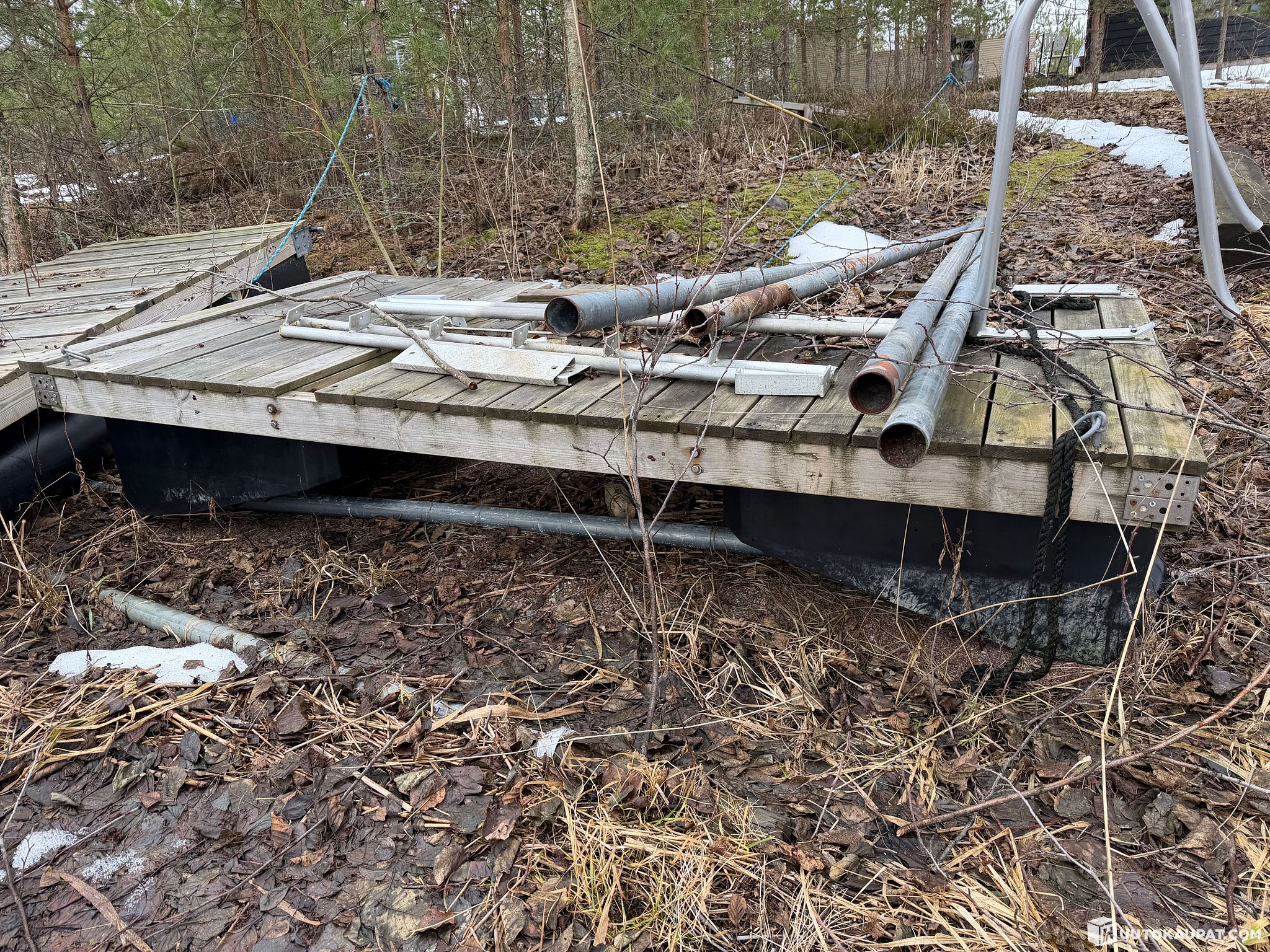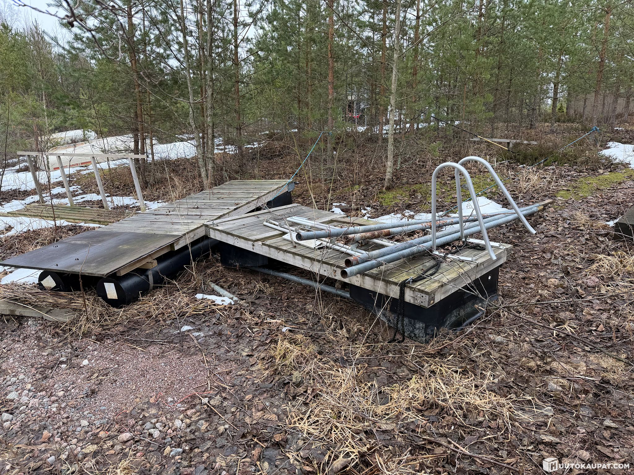 Konkurssipesä myy kuvien laiturin. Kivien päällä oleva laiturin osa on kiinnitetty maahan, mikäli ostaja vie kyseisen pätkän mukanaan niin ostaja vastaa osan irroituksesta.