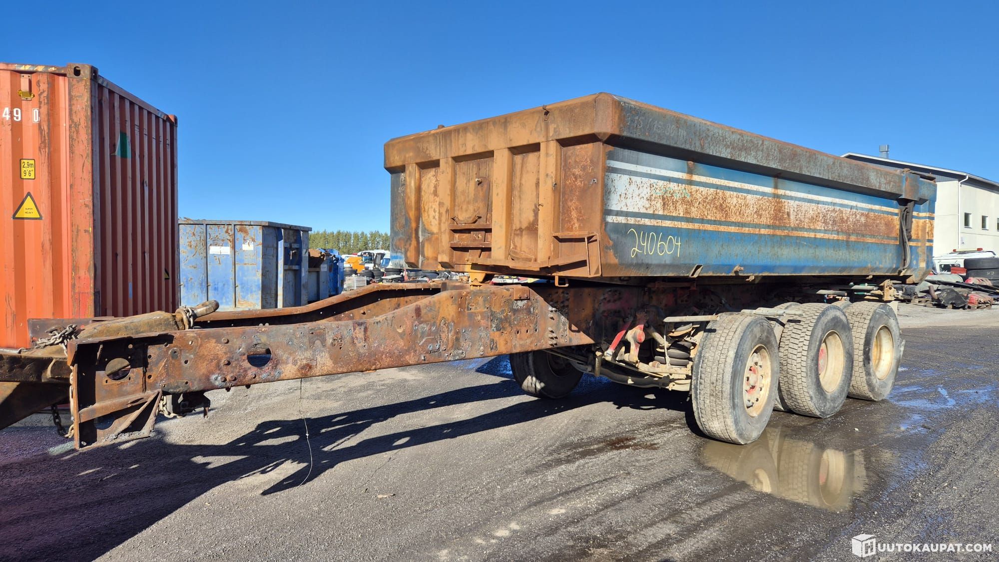 Kärryaihio. Lava noin 6m pitkä. 1m laidoilla. Perä paikallaan mahdollisuus tehdä vetäväksi. Auton ohjaamo palanut, lavasta maalit pois paikoitellen.