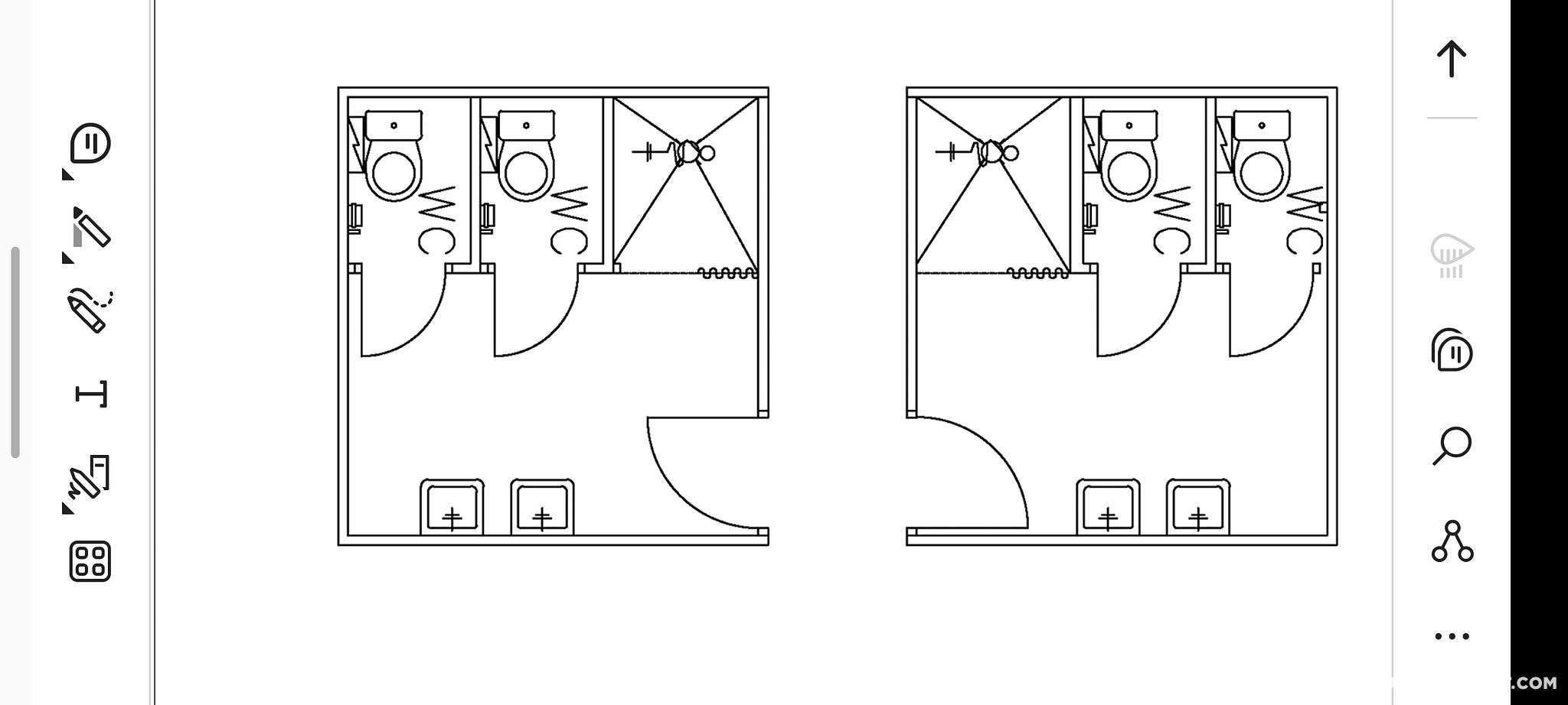 Toisella puolella 2 wc:tä ja suihku ja toisella puolella 2 wc:tä ja suihku.