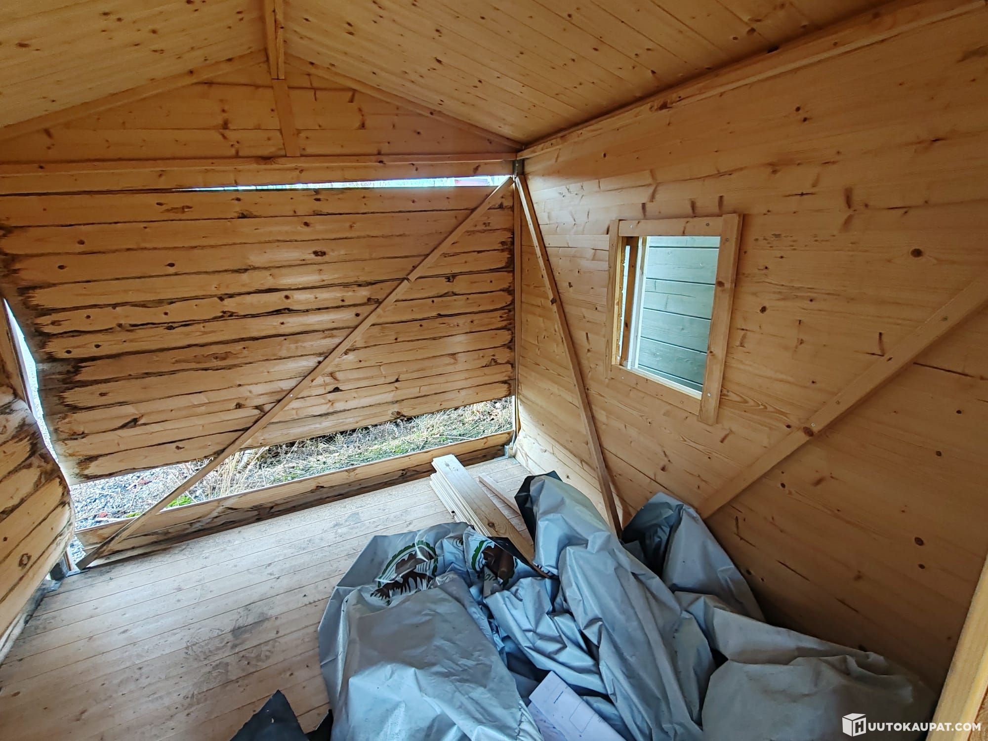 Tuotepakettiin kuuluvat seinäpaneeleiden, oven ja ikkunoiden sekä lattia- ja kattolautojen lisäksi helat, naulat ja ruuvit.