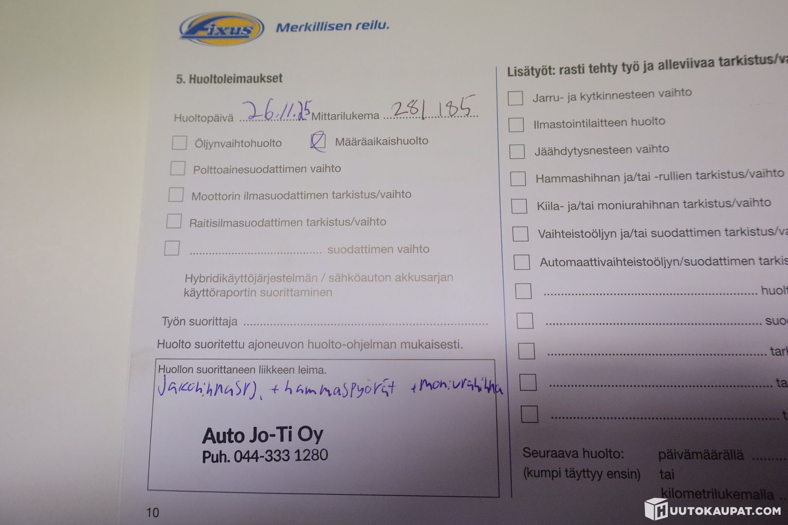 Viimeisin jakohihnan vaihto tehty 281tkm kilometriä ajettuna 11/ 2025
