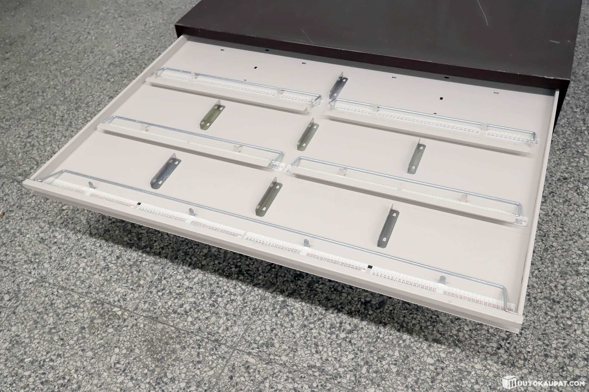 Metallinen piirustus-/ karttalaatikosto. Ideaalinen monenlaiseen keräilyyn (perhoset, rahat, pullonkorkit, tms).