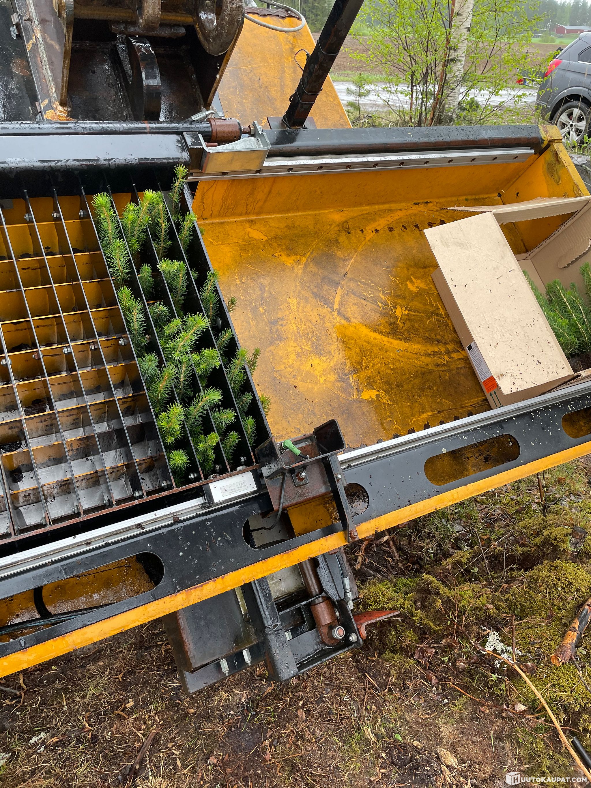 Juuri huollettu istutuskone Risutecin tehtaalla Nakkilassa. Kaikki toimii, huollettu säännöllisesti. Ei mikään loppuunajettu, ollut pienellä käytöllä. Mukaan kuvassa näkyvä kuljetusteline. Sovitteet S-60 sekä NTP-10. Ollut käytössä 14-15t kaivinkoneessa, ihan käypänen yhdistelmä, pari tonnia pienimpäänkin käy. Alkuperäisestä konetta muokattu tekemällä huulilevystä leveämpi, hyvä etenkin heinittymään taipuvaisille maille. Koneeseen kuuluvat osat kaikki mukana, Risutecin kanssa voi sopia omaan kaivinkoneeseen asennuksesta. Nostetaan kyytiin. Myydään ajanpuutteen vuoksi, taimien istutus sesonki kun osuu päällekkäin muiden töiden kanssa.