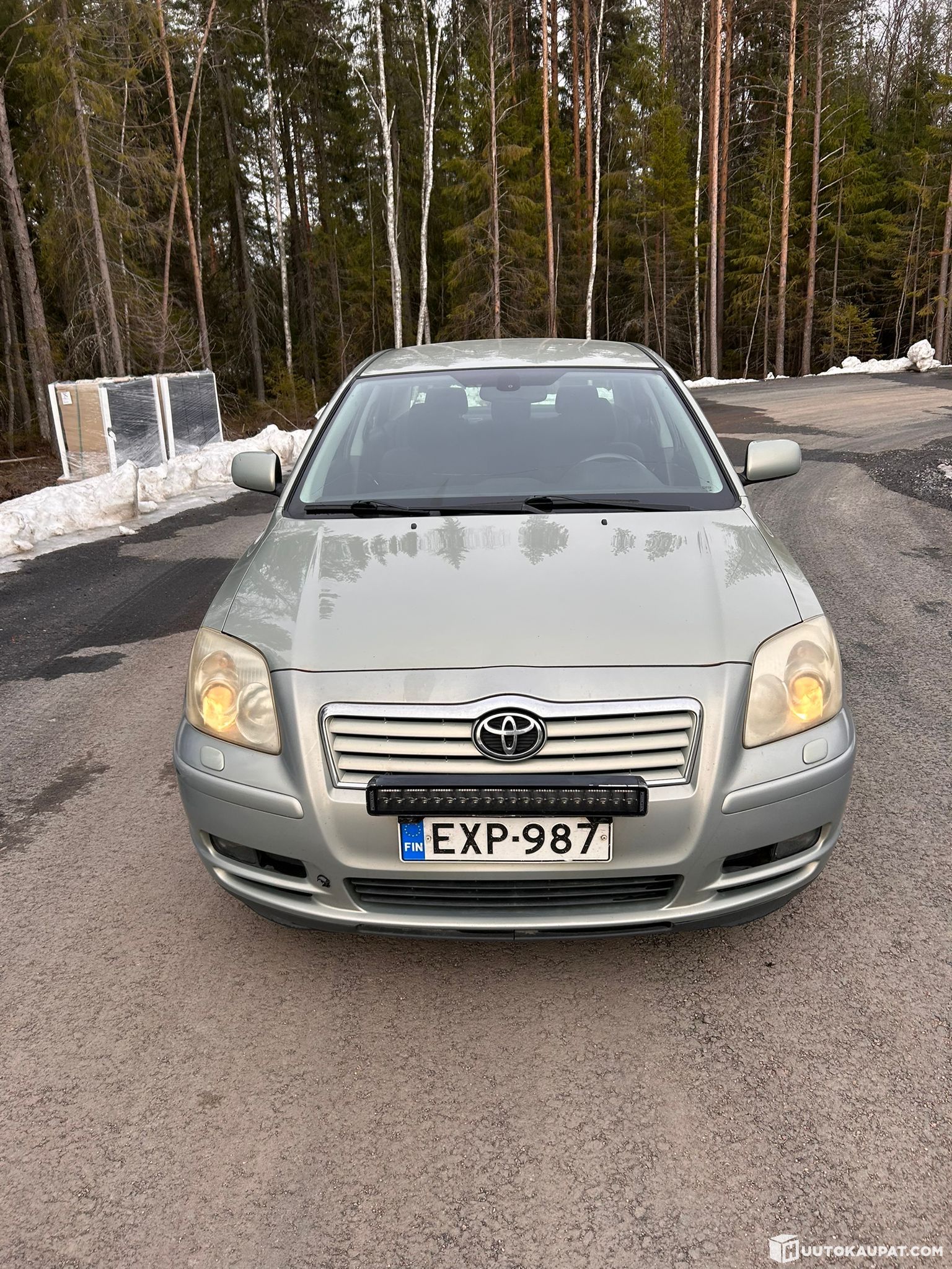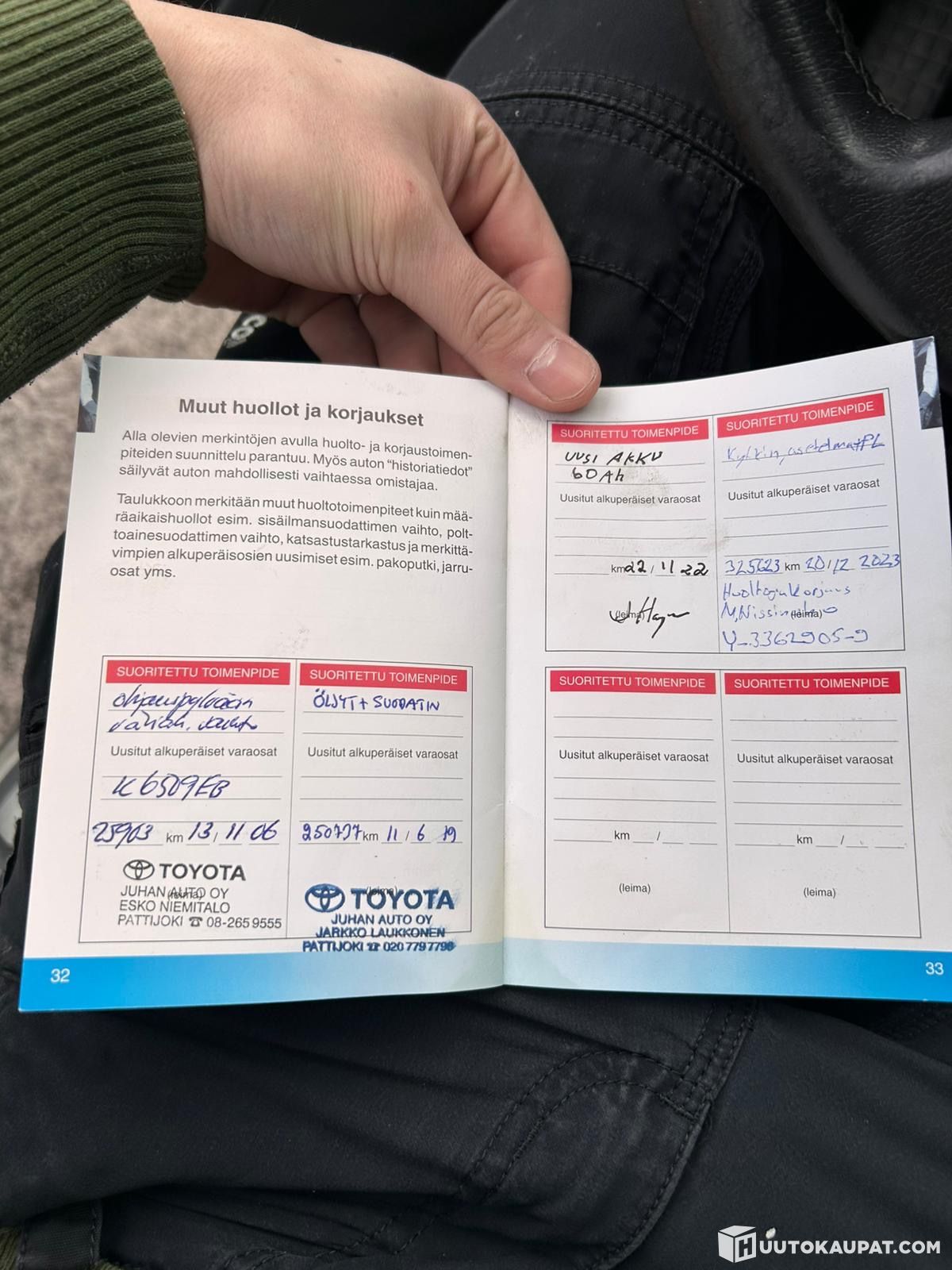 Kytkin remontti tehty noin 300 000 näkyy huoltokirjassa (kuvissa). Käytön jälkiä on tän ikäsessä autossa ja tuulilasissa halkeama. Kahdet alumiini vanteilla olevat renkaat mukaan. Talvirenkaat on hyvät kesärenkaatki ihan ok. Lisävalo paneelikin mukaan.