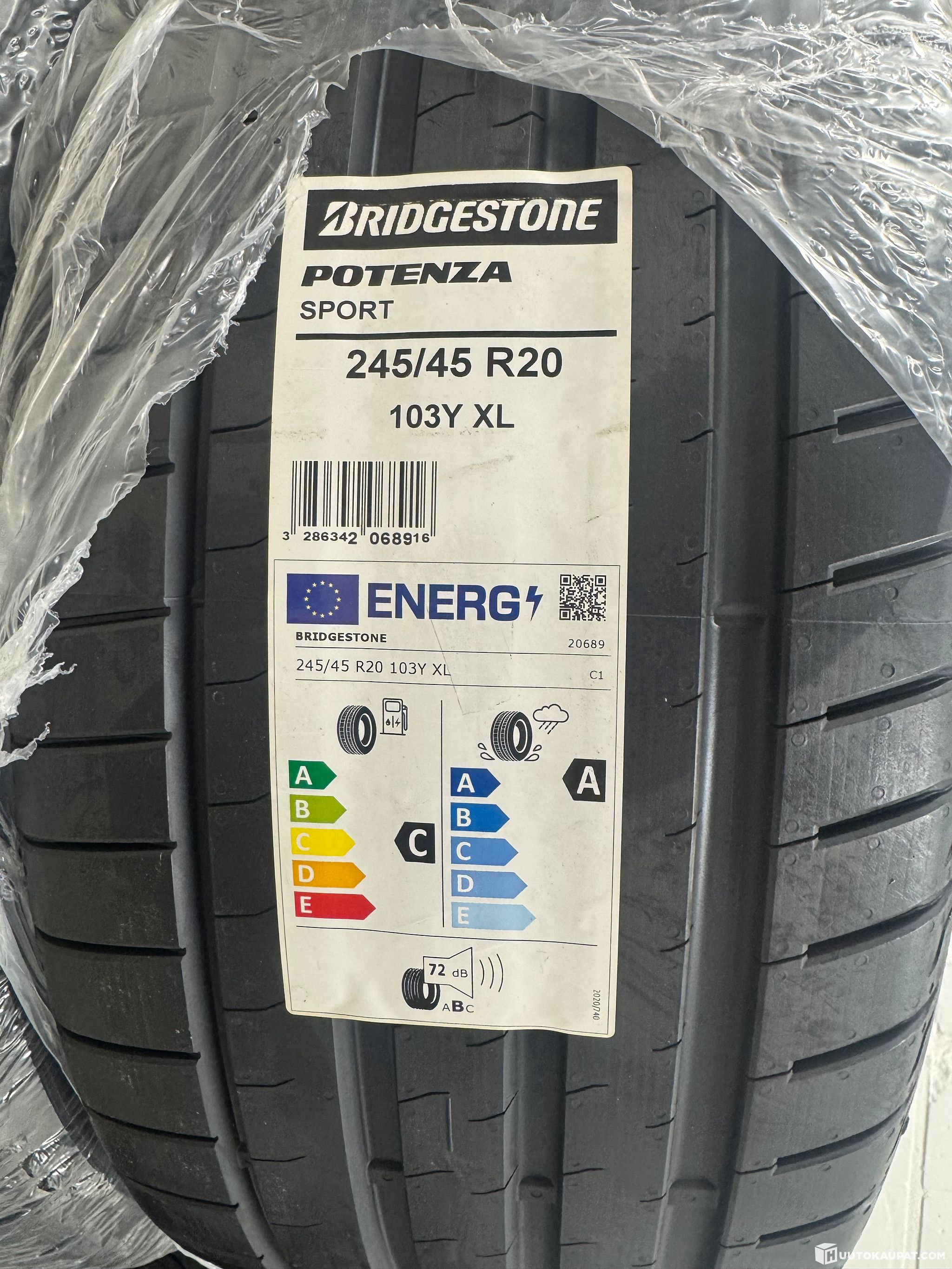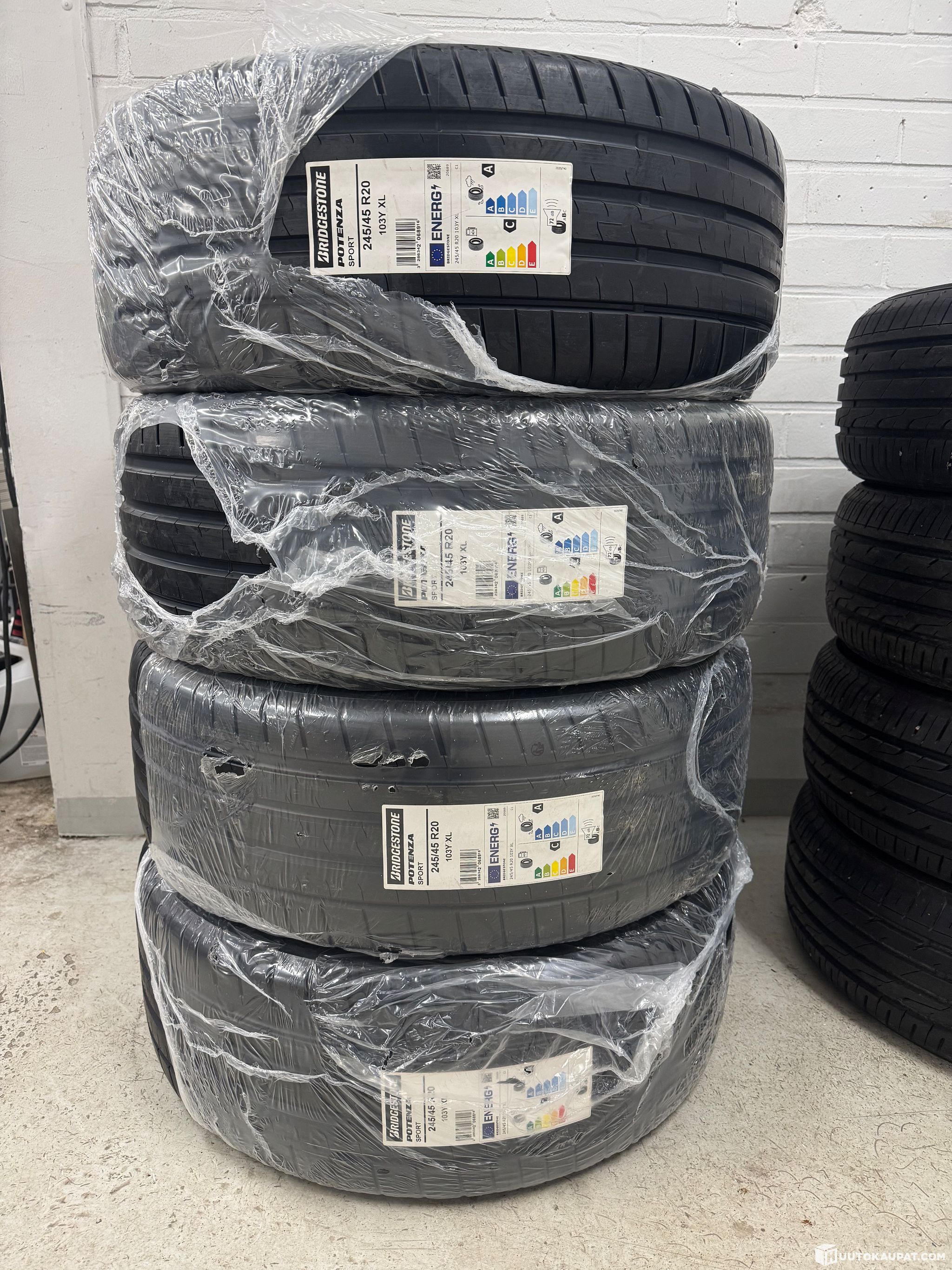 Uudet käyttämättömät laaturenkaat tehtaan muoveissa. Renkaiden valmistusvuosi -22.