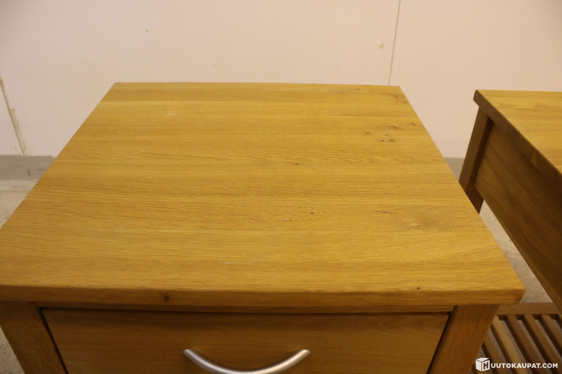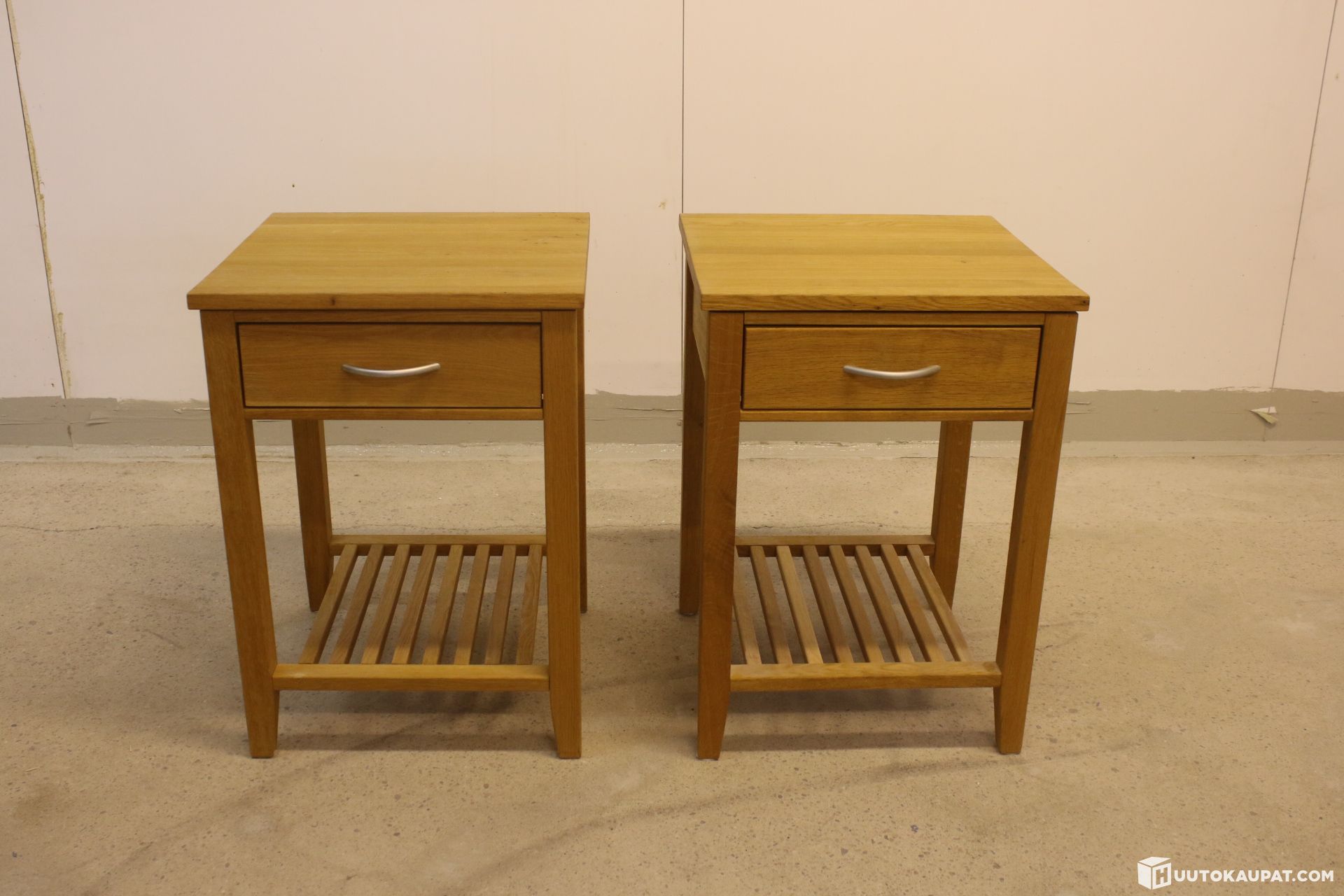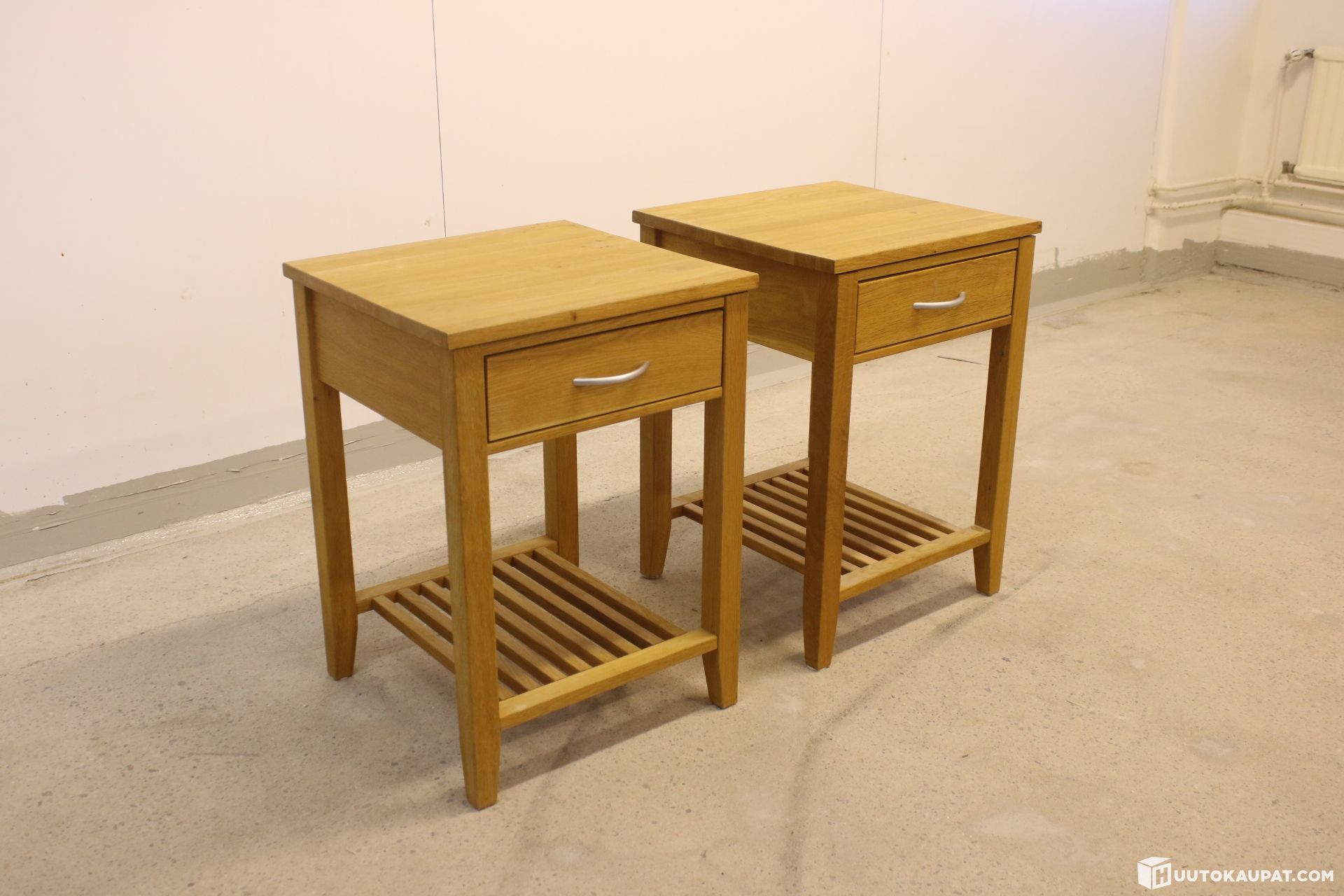 Kaksi kappaletta puisia yöpöytiä.