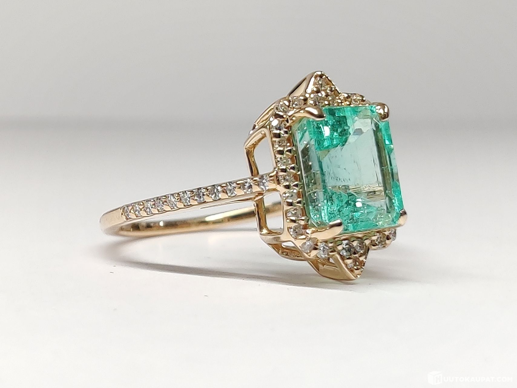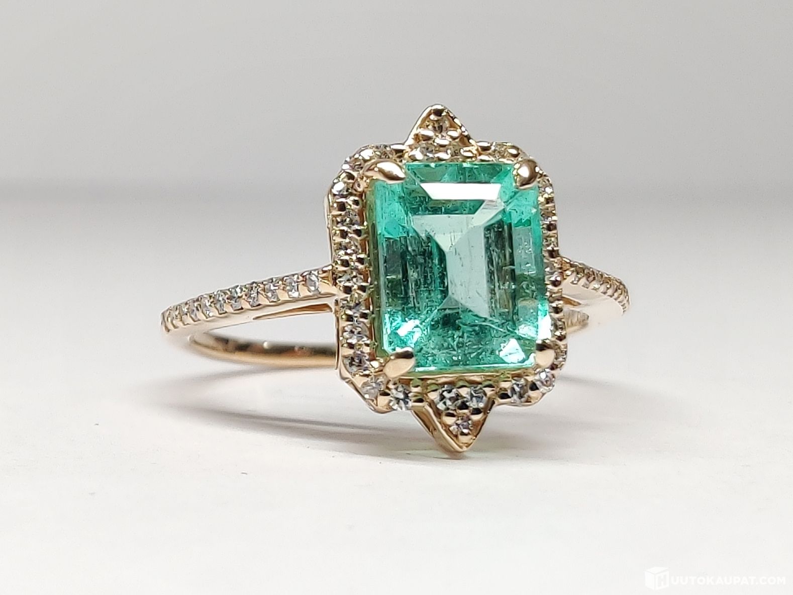 Todella kaunis ja näyttävä timantein koristeltu smaragdisormus 14k kultaa.