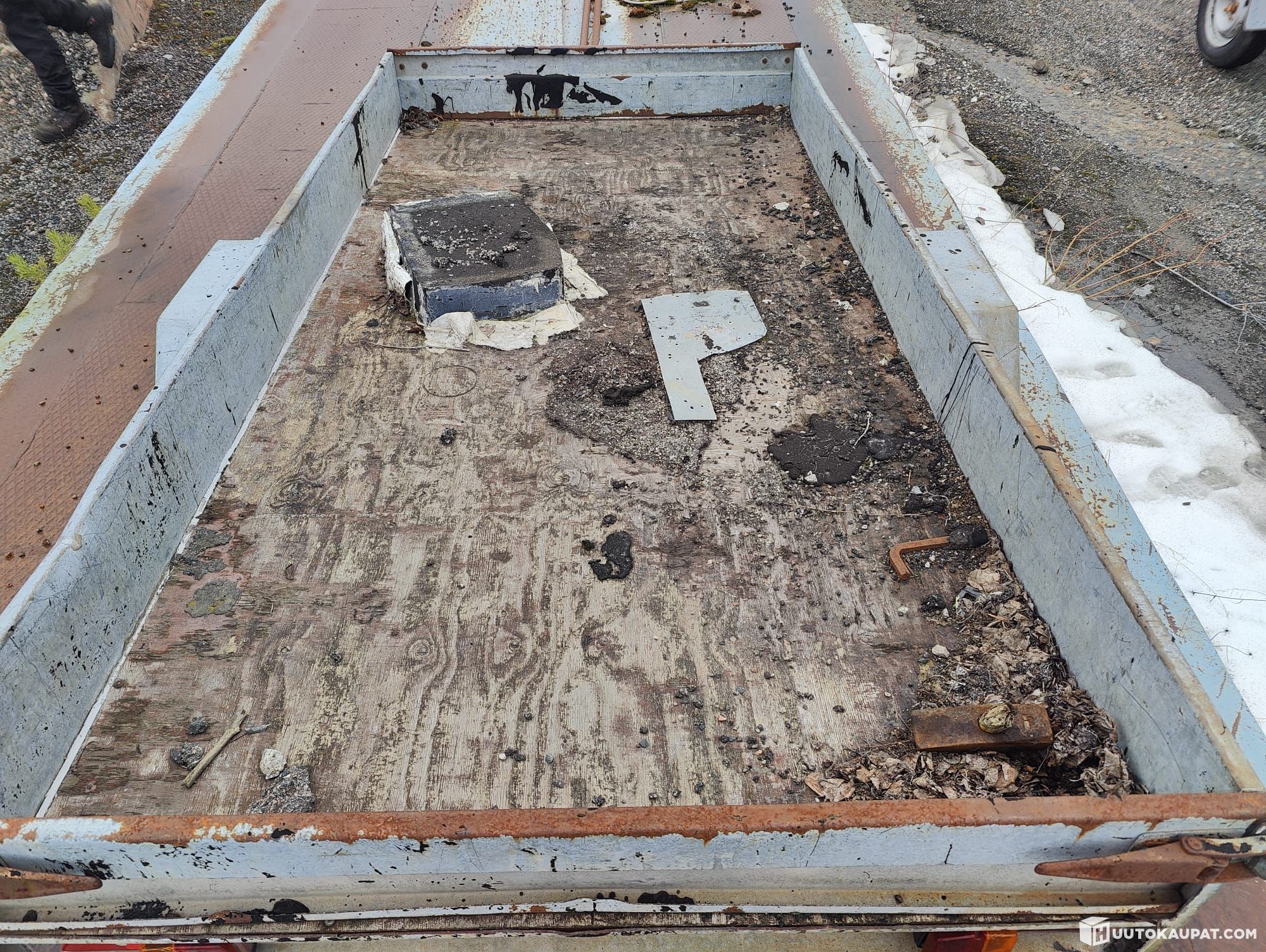 Havaittuja vikoja tyhjä rengas ja pohjavanerin kunto. Kuvista nähtävissä peräkärryn yleiskunto.