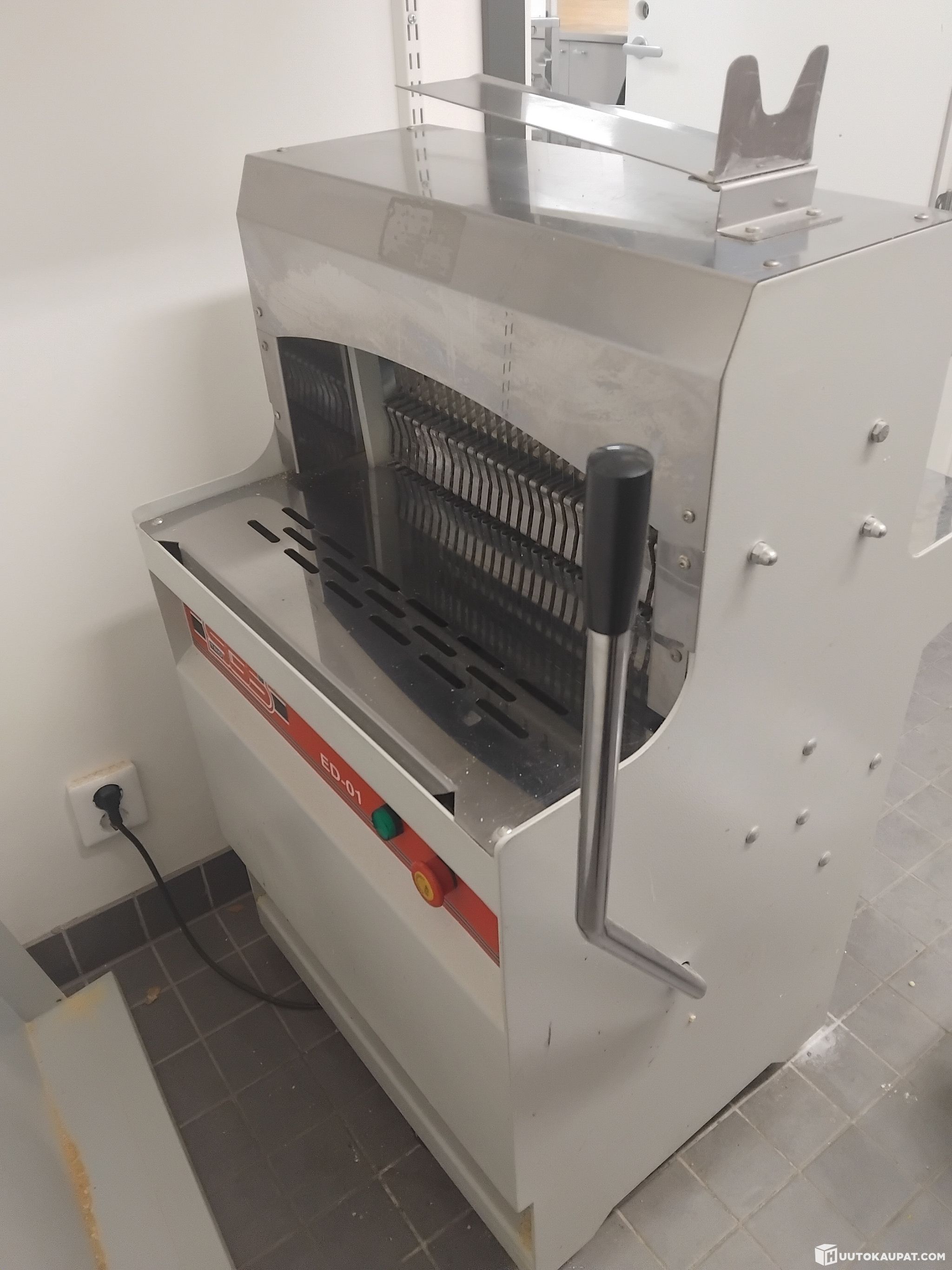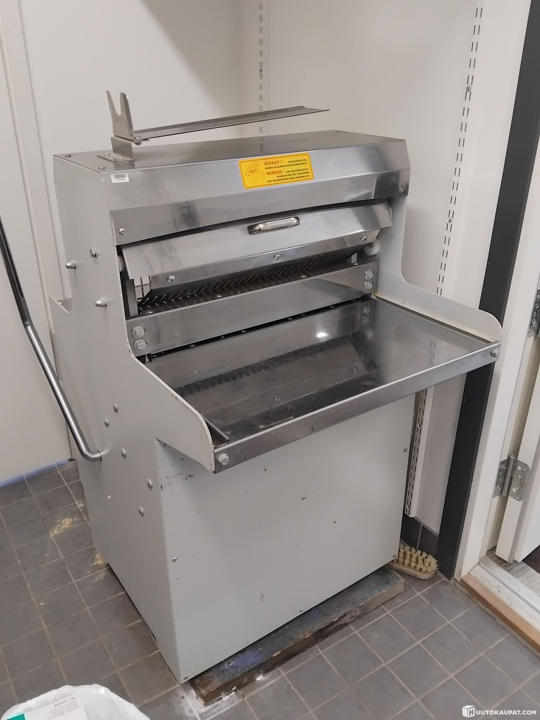 Vaalealle leivälle siivuttaja 16mm terällä. Alapuolella säiliö, johon menee siivuttamisesta aiheutuneet leivänmurut. Täysin uutta vastaavassa kunnossa. Myydään pois leipomon lopettamisen vuoksi.