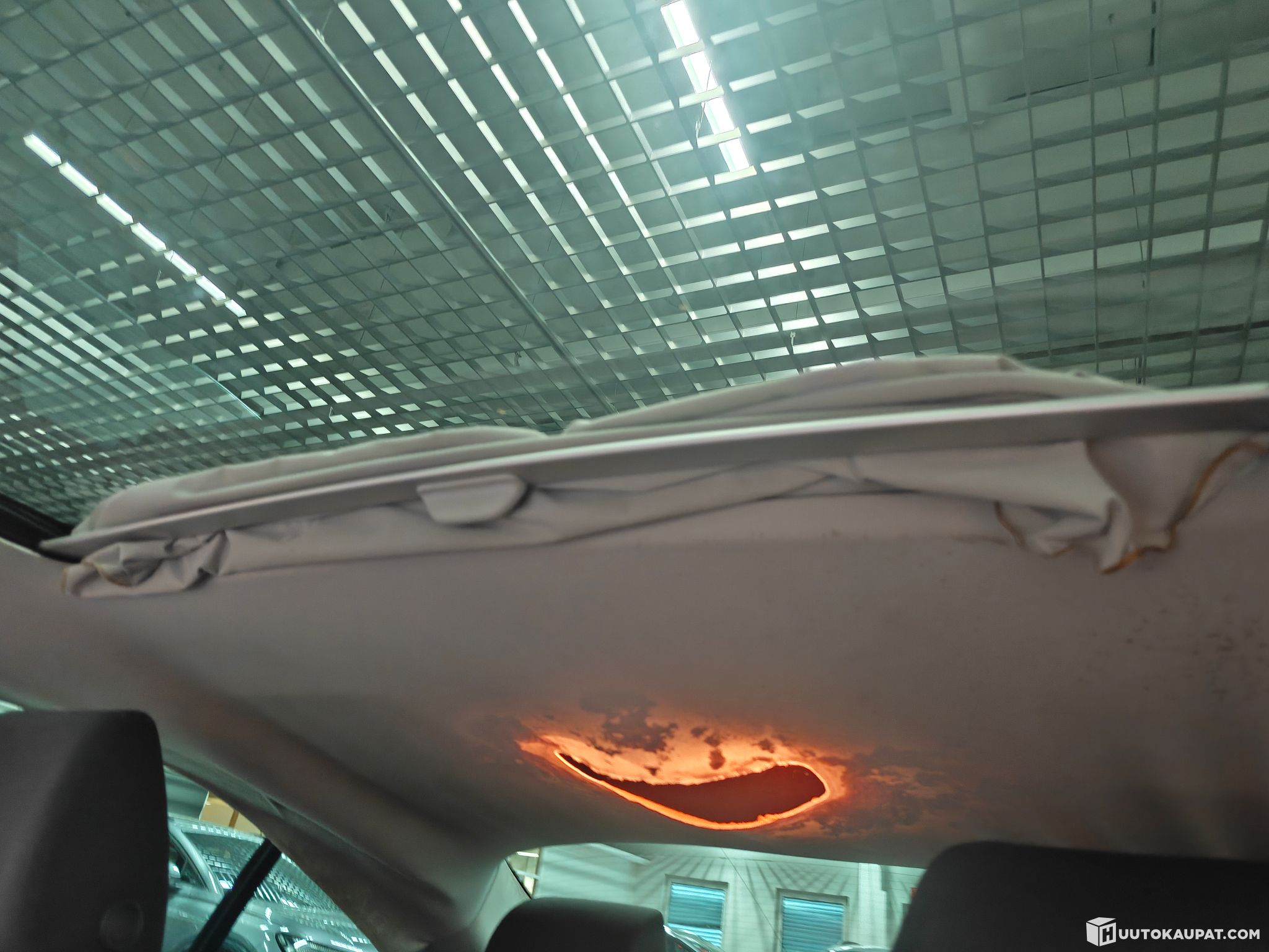 Kattoverhoilu repsottaa, liimaukset pettäneet ja varmaan jokin ommel. Kattoluukun suojaverho myös lerpattaa.