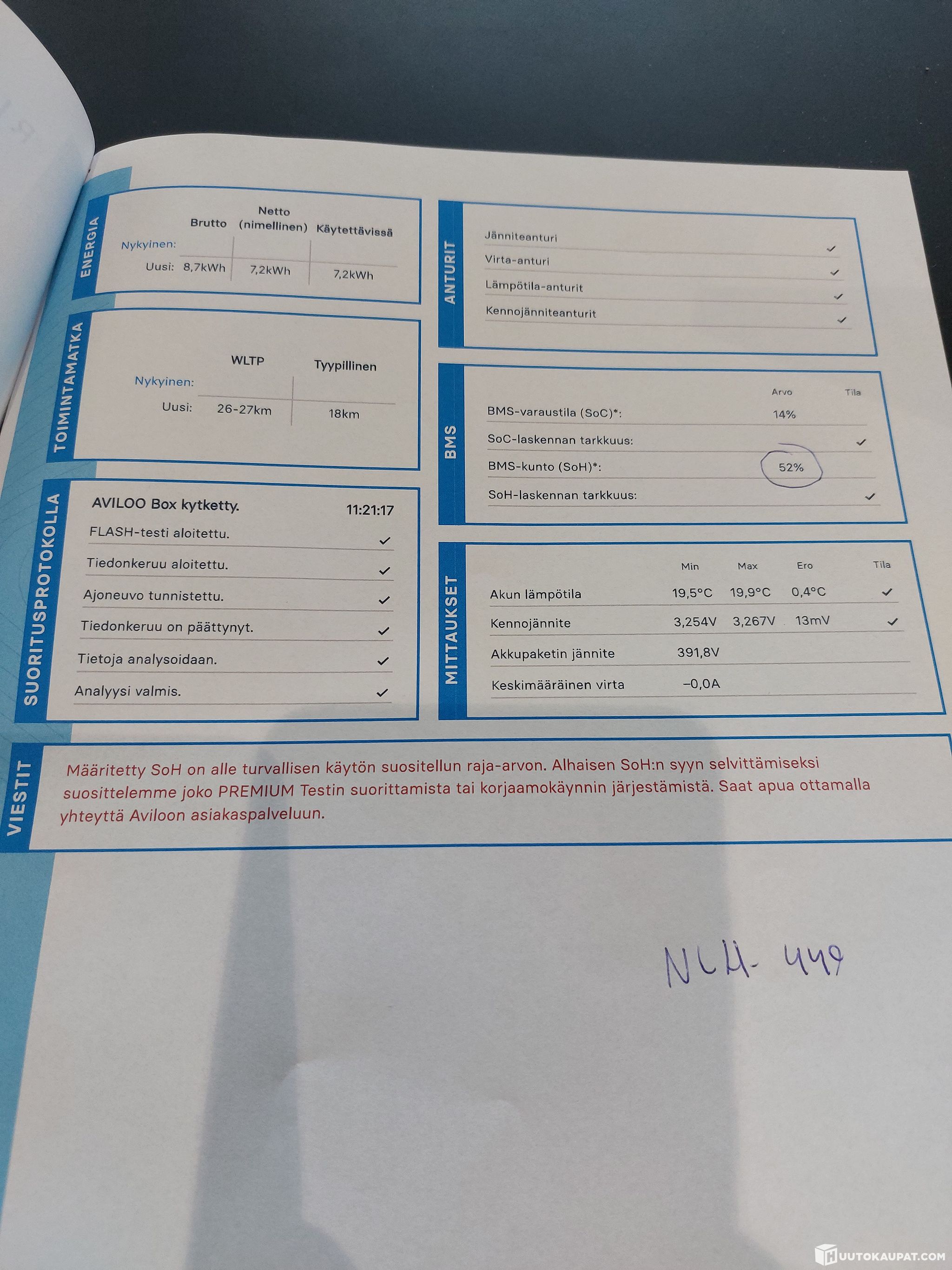 - Akuston kuntoraportti kuvissa, BMS-kunto ( SOH 52% ) Aviloo testi.