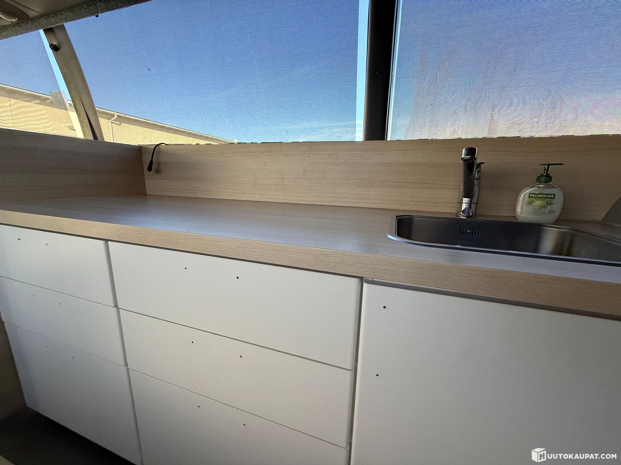 Etuosassa pöydät ja tuolit, keskellä keittiö ja wc/suihku (ei mikään kylpyhuone mutta siis wc, bidee ja lattiakaivo eli rundikontekstissa ihan lux-spa).