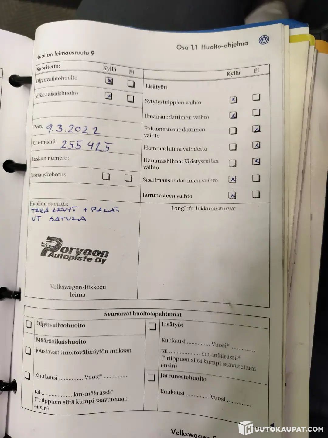 30tkm, 53tkm, 77tkm, 107tkm, 119tkm, 138tkm + ilmastointihuolto, 153tkm, 178tkm, 255tkm + takalevyt ja palat, 259tkm & 282tkm.