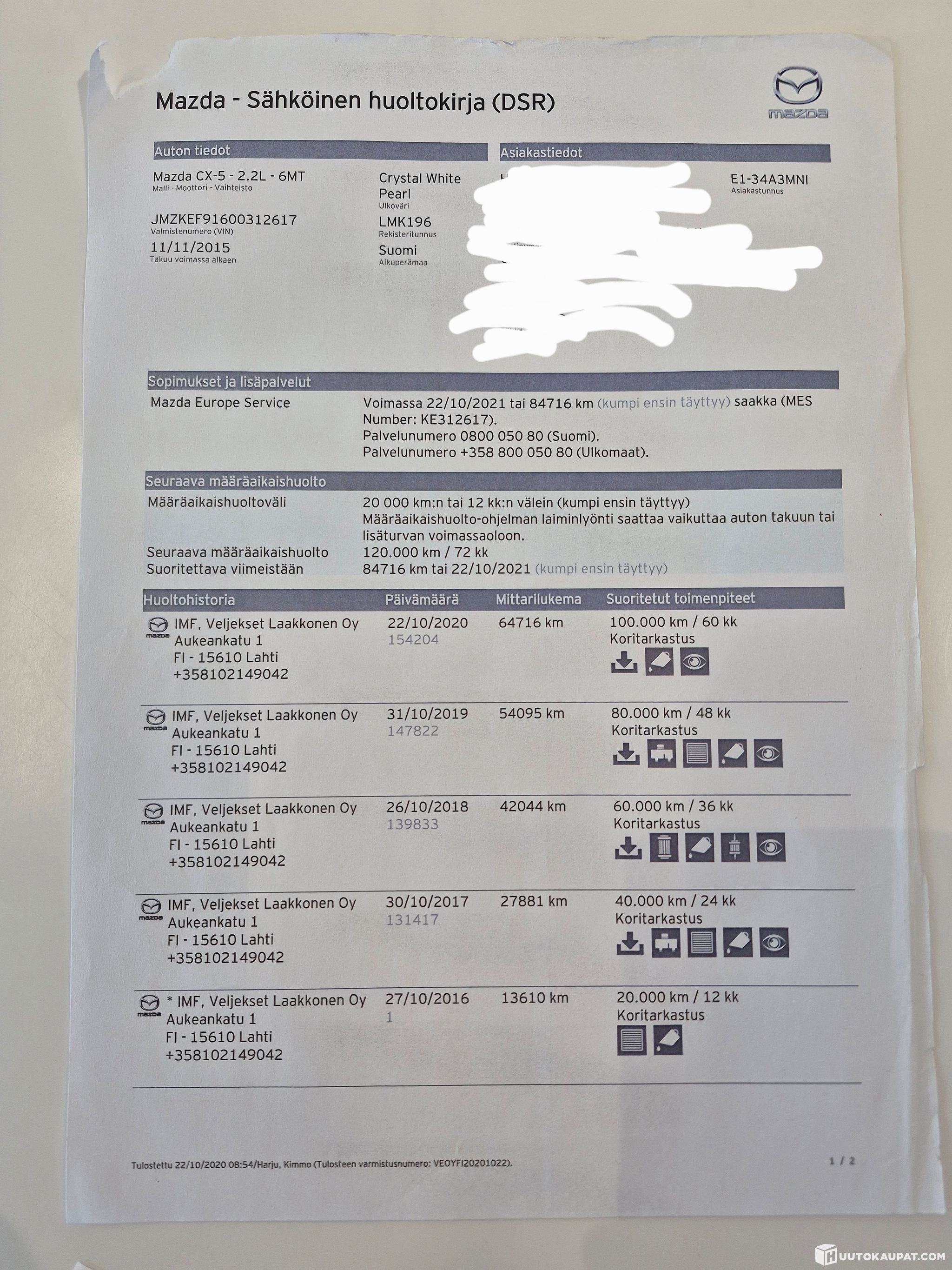 Auton mukana kuitteja kansiollinen, kuvasin tärkeimmät huollot ilmoitukseen.