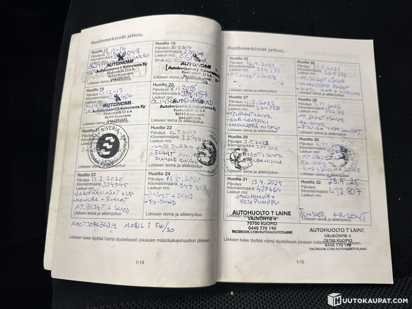 Huoltokirja täynnä leimoja. Säännöllisesti huollettu.