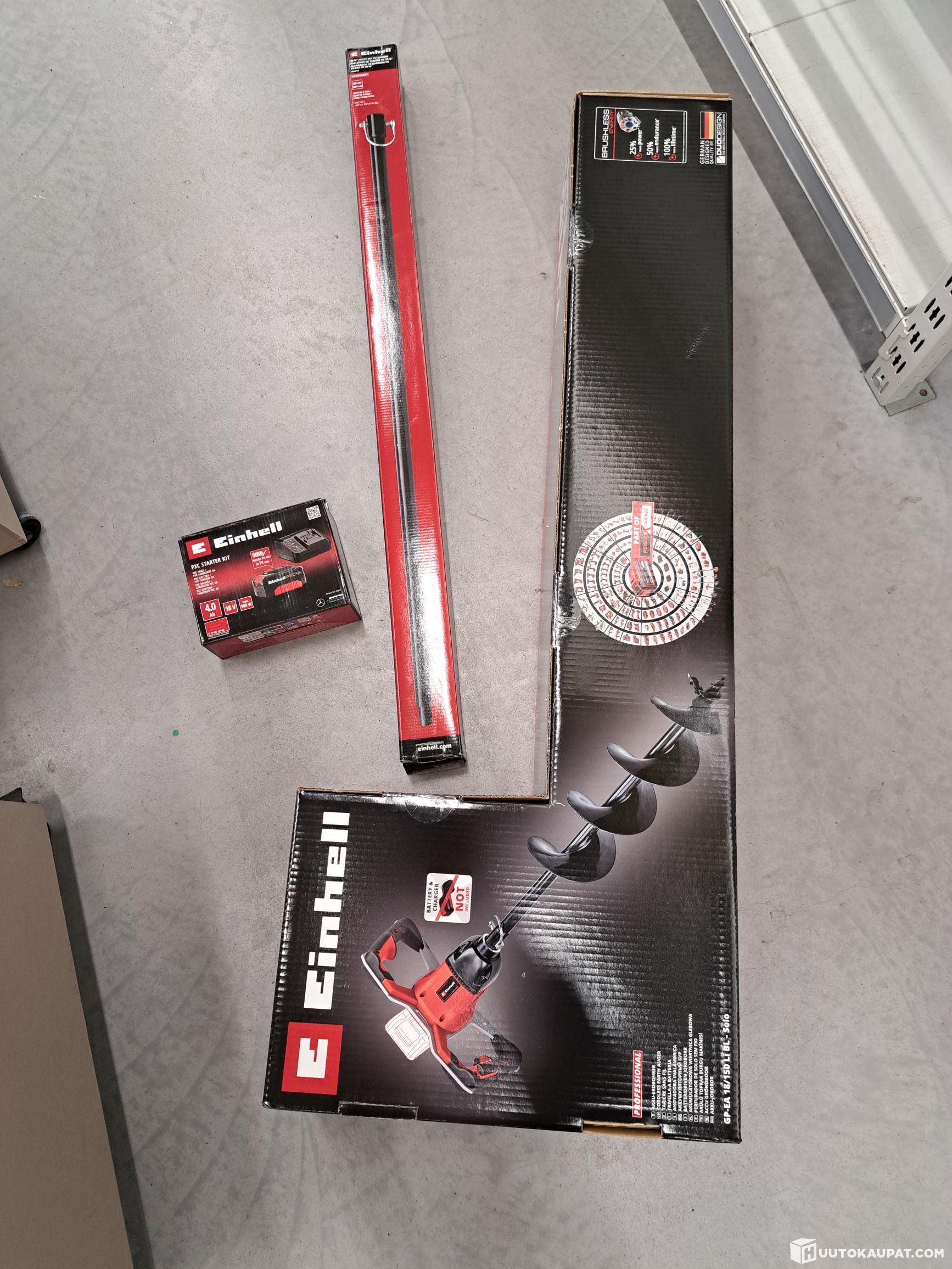Kuvanmukaiset Einhell tuotteet. Akkupaketti matkassa.