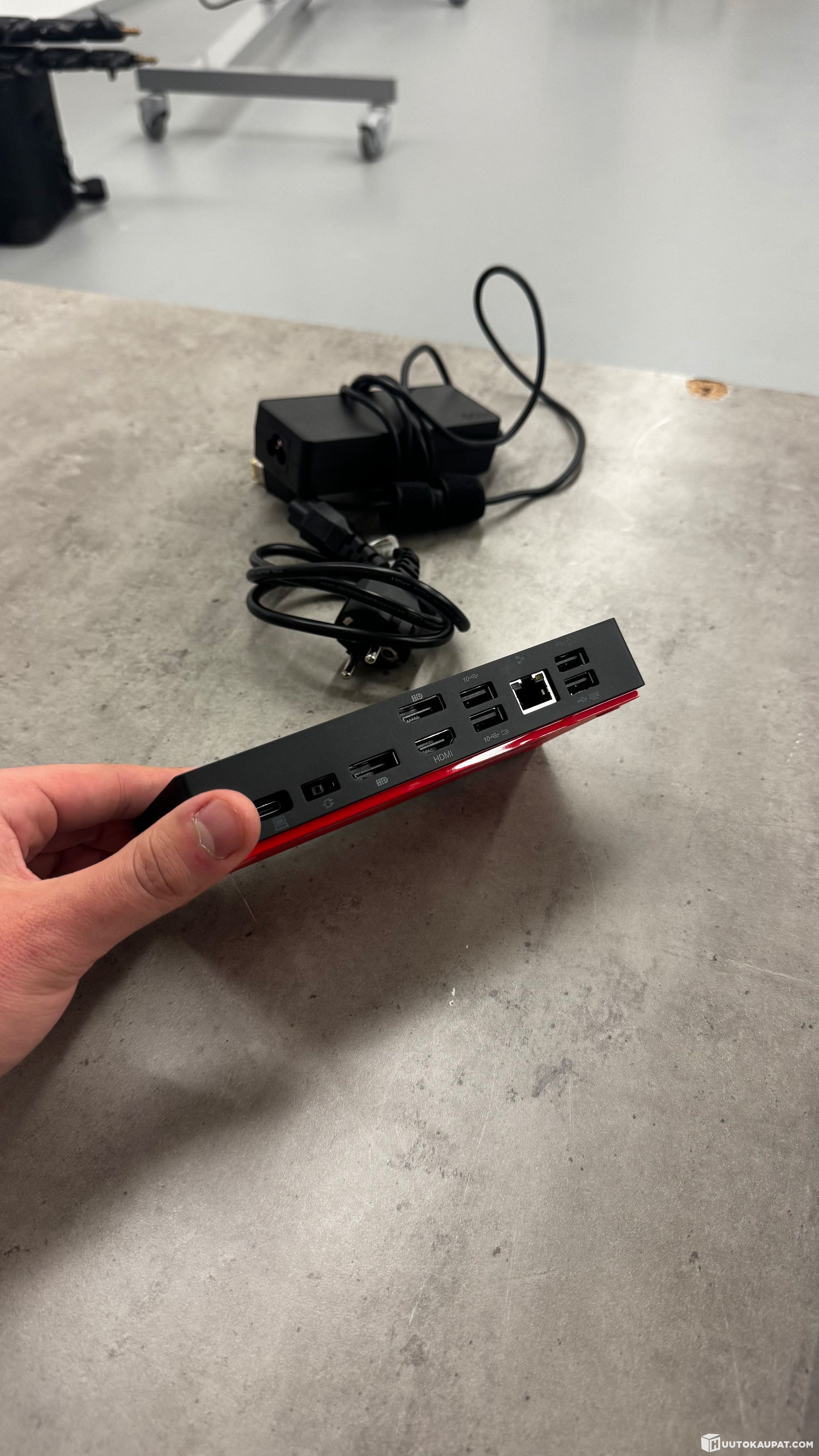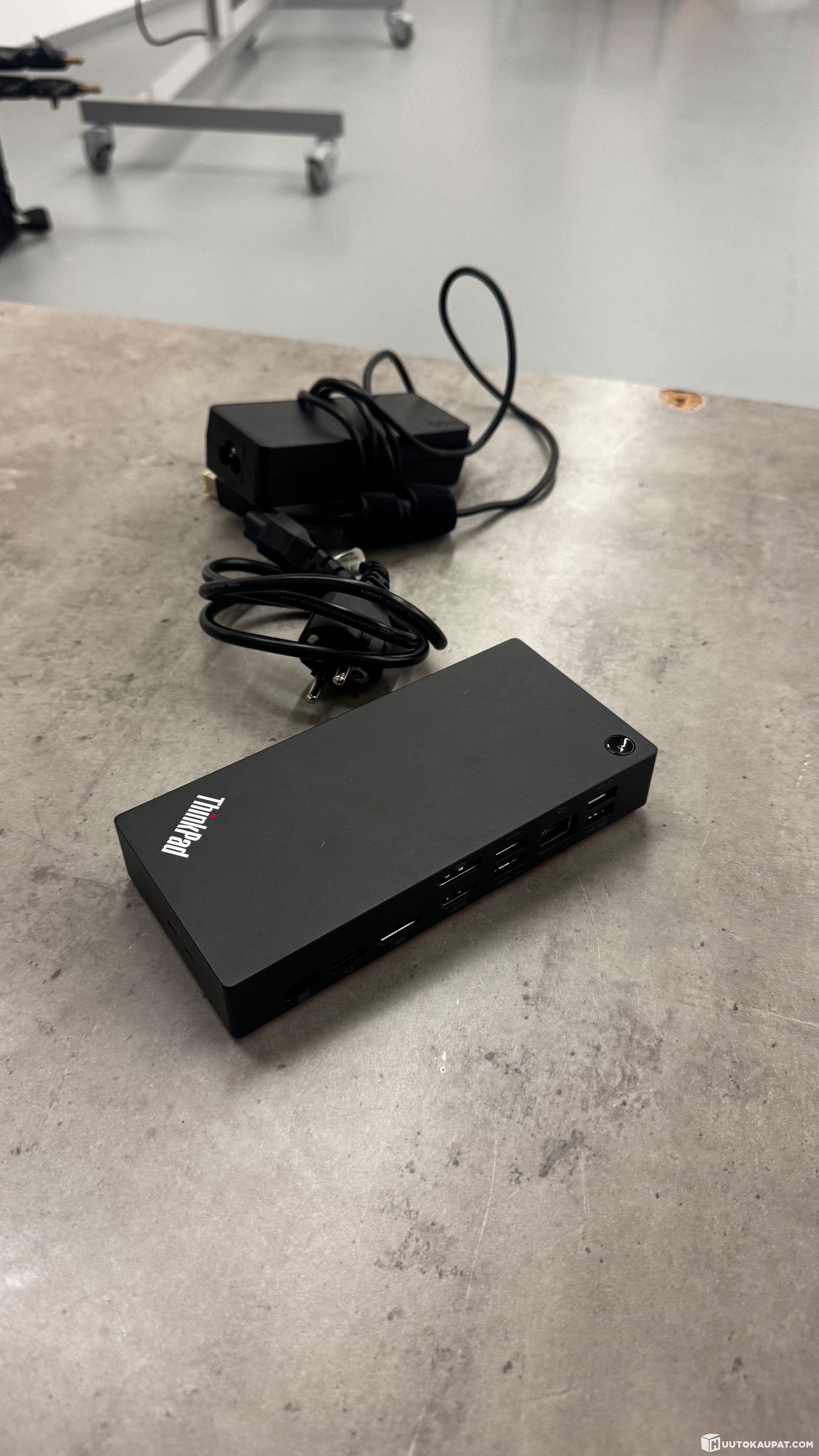 Uuden veroinen Lenovo ThinkPad telakointiasema. Väri musta, sivuilla punainen korosteväri. Useita liitäntöjä, kuten USB-portteja ja verkkoliitäntä. Mukana virtalähde. Soveltuu kannettavantietokoneen liittämiseen oheislaitteisiin yhdellä USB-C kaapelilla, esimerkiksi näyttöihin, näppäimistöön, hiireen ja verkkoon.