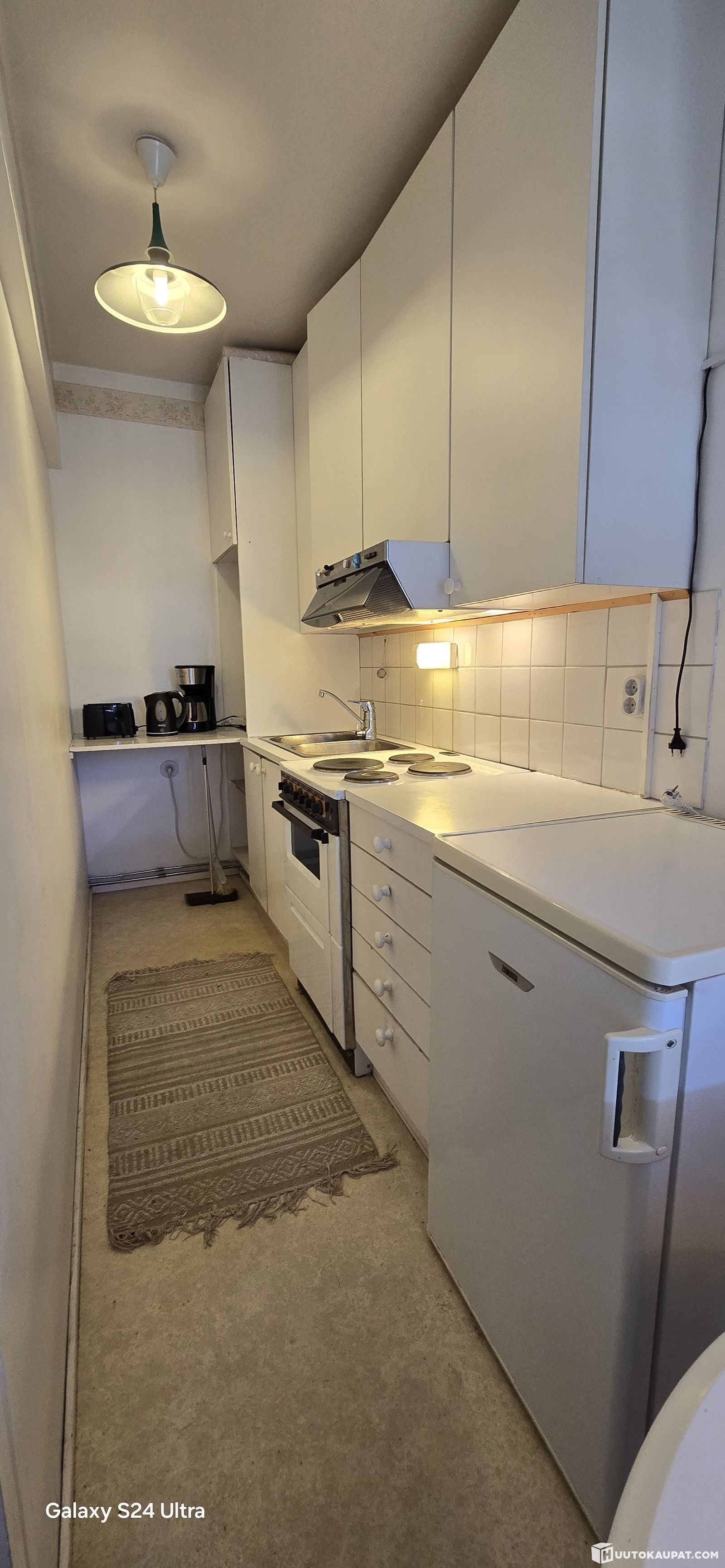 Keittiön kuvaus: Keittokomerossa on jääkaappi/pakastin, sähköliesi ja liesituuletin. Ikkunan puoleiselle seinustalle mahtuu pieni pöytä tuoleineen.