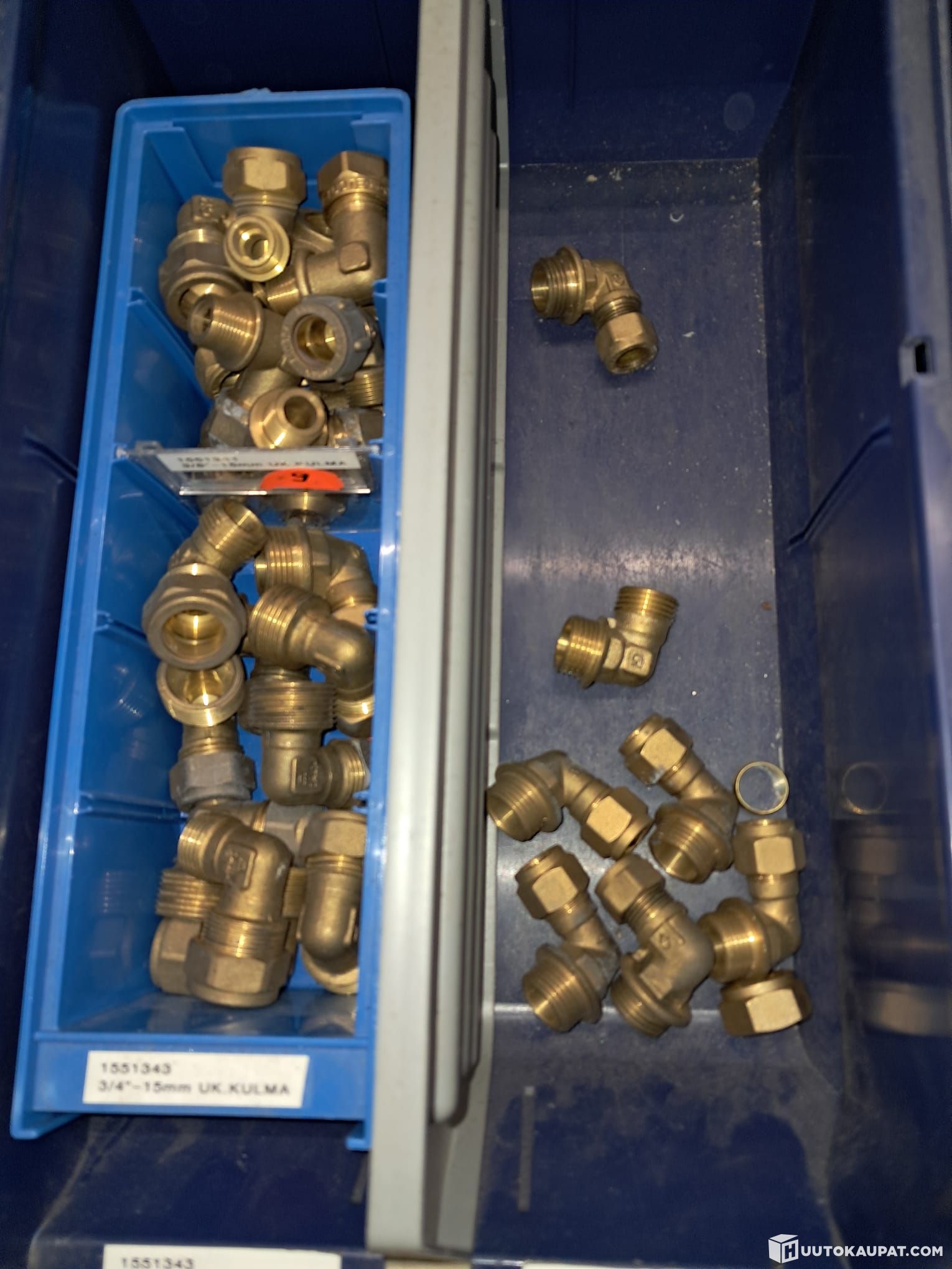 Erä on peräisin LVI-alan yrityksestä ja liittimet on varastoitu siististi lokerikkoon lajiteltuna tuotekoodien mukaan.