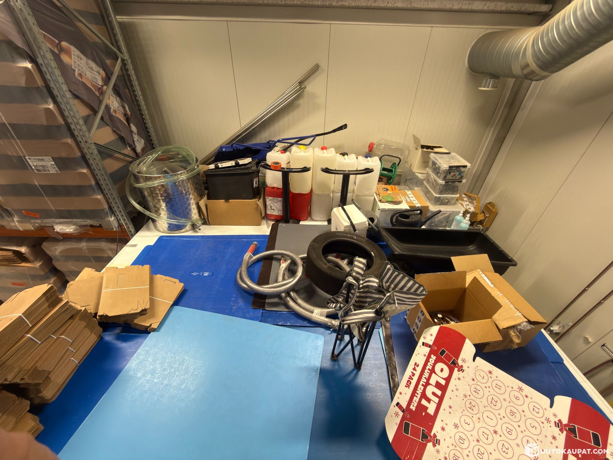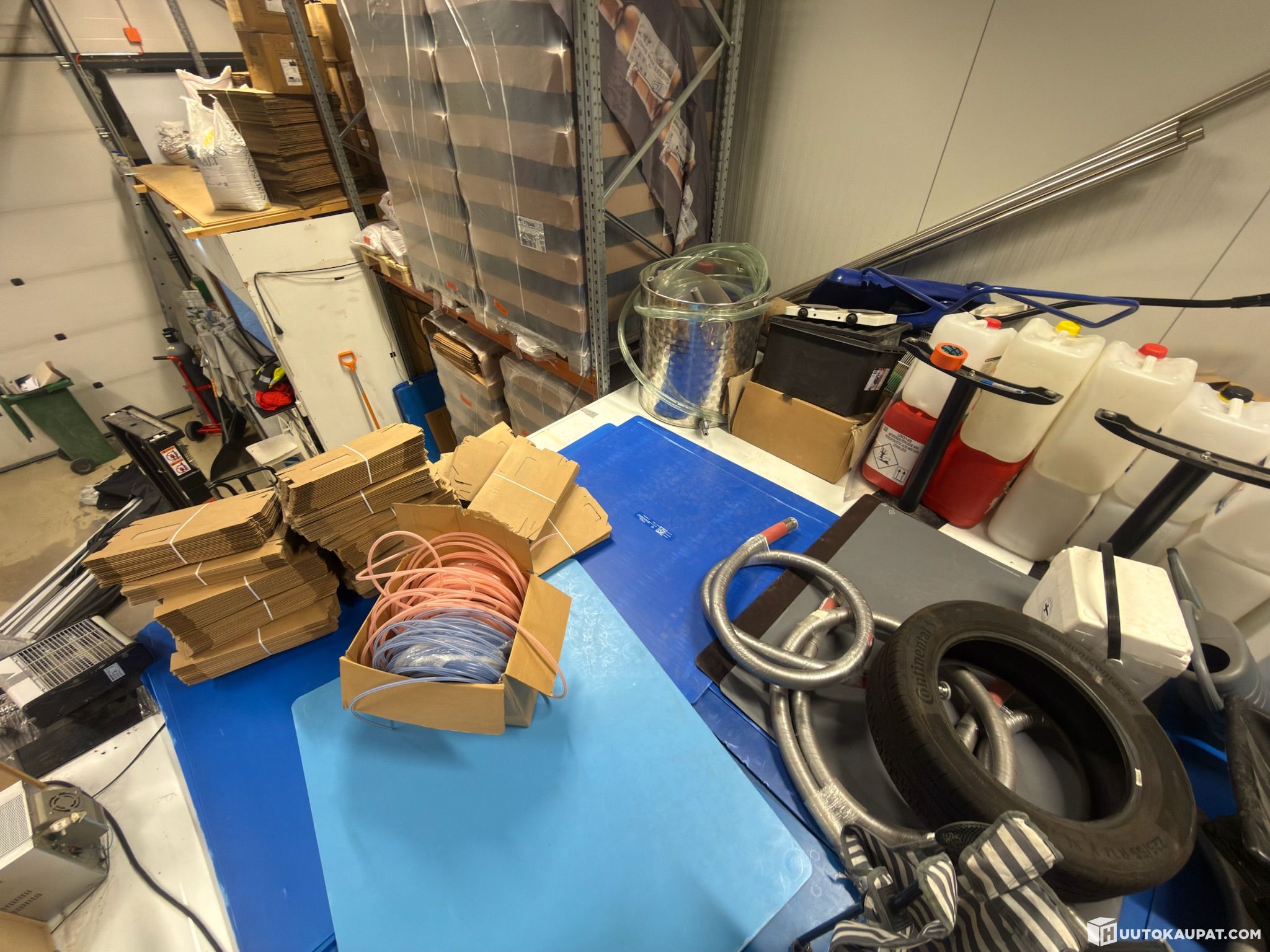 Sekalaista tavaraa kylmiön päällä (käymistankin varaosia, kattila yms.)